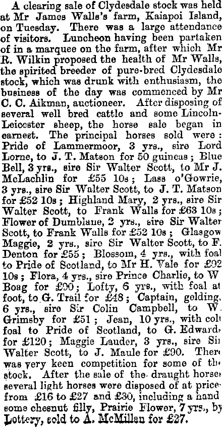 A clearing sale of Clydesdale stock was held at Mr James Walls’s farm, Kaiapoi Island, on Tuesday. There was a largo attendance of visitors. Luncheon having been partaken of in a marquee on the farm, after which Mr B. Wilkin proposed the health of Mr Walls, the spirited breeder of pure-bred Clydesdale stock, which was drunk with enthusiasm, the business of the day was commenced by Mr C. C. Aikman, auctioneer. After disposing of several well bred cattle and some LincolnLeicester sheep, the horse sale began in earnest. The principal horses sold were : Pride of Lammermoor, 3 yrs., sire Lord Lome, to J. T. Matson for 50 guineas ; Blue Bell, 3 yrs., sire Sir Walter Scott, to Mr J. McLachlin for £55 10s; Lass o’Gowrie, 3 yrs., sire Sir Walter Scott, to J. T. Matson for £52 10s ; Highland Mary, 2 yrs., sire Sir Walter Scott, to Frank Walls for £63 10s ; Flower of Dumblaue, 3 yrs., sire Sir Walter Scott, to Frank Walls for £52 10s ; Glasgow Maggie, 2 yrs., sire Sir Walter Scott, to F. Denton for £55 ; Blossom, 4 yrs., with foal to Pride of Scotland, to Mr H, Yale for £92 10s ; Flora, 4 yrs., sire Prince Charlie, to W Boag for £9O; Lofty, 6 yrs,, with foal ai foot, to G. Trail for £4B; Captain, gelding, 6 yrs., sire Sir Colin Campbell, to W. Grimsby for £sl; Jean, 10 yrs., with colt foal to Pride of Scotland, to G. Edward.for £120; Maggie Lauder, 3 yrs., sire Si) Walter Scott, to J. Maule for £9O. There was yery keen competition for some of th* stock. After the sale of the draught horset several light horses were disposed of at pricefrom £l6 to £27 and £3O, including a hand some chesnut filly, Prairie Flower, 7 yrs,, by pottery, sold to A. HcMillau for £27.