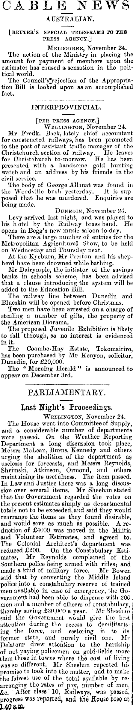 CAB LE_ NEWS AUSTRALIAN. [eeutee's special telegrams to thb pbess agency.] Meluoubne, November 24. The action of the Ministry in placing the amount for payment of members upon the estimates has caused a sensation in the political world. The Council's'rejection of the Appropriation Bill is looked upon as an accomplished fact. INTERPROVINCIAL. [PEB PRESS AGENCY.] Wellington, November 24. Mr Eredk. Back, lately chief accountant for constructed railways, has been promoted to the post of assistant traffic manager of the Christchureh section of railway. He leaves for Christ'jhurch to-morrow. He has been presented with a handsome gold hunting watch and an address by his friends in the civil service. The body of George Allanat was found in the Woodville bush yesterday. It is supposed that he was murdered. Enquiries are being made. Dunedik, November >M. Levy arrived last night, and was played to his hotel by the Railway brass band. He opens in Begg's new music saloon to-da.y. There are a large number of entries for the Metropolitan Agricultural .Show, to be held on Wednr-sday and Thursday next. At the Kjeburn, Mr Preston and his shepherd have been drowned while bathing. Mr Dairyinple, the initiator of the savings banks in schools scheme, has been advised that a clause introducing the system will be added to the Education Bill. The railway line between Dunedin and Blueskin will be opened before Christmas. Two men have been arrested on a charge of stealing a number of gifts, the property of the American Diorama. The proposed Juvenile Exhibition is likely to fall through, as no interest is evidenced in it. The Coombe-Hay Estate, Tokomairiro, has been purchased by Mr Kenyon, solicitor, Dunedin, for £20,000. The " Morning Herald" is announced to appear on December 3rd. PARLIAMENTARY. Last Right's Proceedings. Wellington, November 24. The House went into Committee of Supply, and a considerable number of departments were passed. On the Weather Reporting Department a long discussion took place, Messrs McLean, Burns, Kennedy and others urging the abolition of ths department as iiselesss for forecasts, and Messrs Reynolds, Shrimski, Atkinson, Ormond, and others maintaining its usefulness. The item passed. In Law and Justice there was a long discussion over several items. Mr Sheehan stated that the Government regarded the votes on the present estimates simply as departmental totals not to be exceeded, and said they would rearrange the items as they found desirable, and would save as much as possible. A reduction of £4OOO was moved in the Militia and Volunteer Estimates, and agreed to. The Colonial Architect's department was reduced £2OO. On the Constabulary Estimates, Mr Reynolds complained of the Southern police being armed with rifles; and made a kind of military force. Mr Bowen said that by converting the Middle Island police into a constabulary reserve of trained men available in case of emergency, the Government had been able to dispense with 200 men and a number of officers or constabulary, thereby saving £30,000 a year. Mi- Sheehan said the Government would give the best attention during the recess to demilitarising the force, and restoring it to its former state, and purely civil one. Mr Delatour drew attention to the hardship of not paying policemen on gold-fields more than those in towns where the cost of living was so different. Mr Shoehan repeated his promise to look into the matter, and to make the fairest use of the total available by rearranging the rates of pay, number of men, &c. ' After class' 10, Railways, was passed, progress was reported, and the House, rose at J