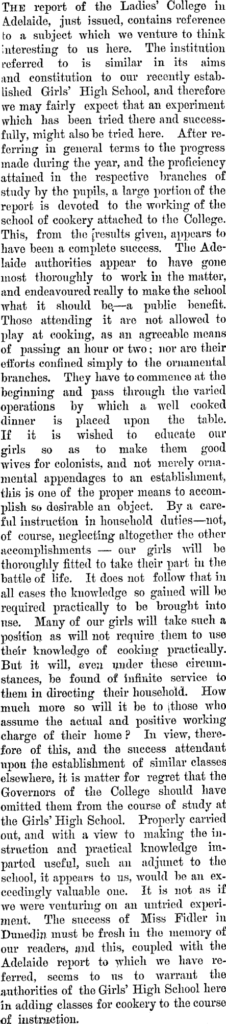 The report of the Ladies’ College in Adelaide, just issued, contains reference to a subject which wo venture to think interesting to us here. The institution referred to is similar in its aims and constitution to our recently established Girls’ High School, and therefore we may fairly expect that an experiment which has been tried there and successfully, might also be tried here. After referring in general terms to the progress made during the year, and the proficiency attained in the respective branches of study by the pupils, a large portion of the report is devoted to the working of the school of cookery attached to the College. This, from the [results given, appears to have been a complete success. The Adelaide authorities appear to have gone most thoroughly to work in the matter, and endeavoured really to make the school what it should be. —a public benefit. Those attending it are not allowed to play at cooking, as an agreeable means of passing an hour or two; nor are their efforts confined simply to the ornamental branches. They have to commence at the beginning and pass through the varied operations by which a well cooked dinner is placed upon the table. If it is wished to educate our girls so as to make them good wives for colonists, and not merely ornamental appendages to an establishment, this is one of the proper means to accomplish so desirable an object. By a careful instruction in household duties —not, of course, neglecting altogether the other accomplishments our girls will be thoroughly fitted to take their part in the battle of life. It does not follow that in all cases the knowledge so gained will be required practically to be brought into use. Many of our girls will take such a position as will not require them to use their knowledge of cooking practically. But it will, even under these circumstances, be found of infinite service to them in directing their household. How much more so will it be to Those who assume the actual and positive working charge of their home ? In view, therefore of this, and the success attendant upon the establishment of similar classes elsewhere, it is matter for regret that the Governors of the College should have omitted them from the course of study at the Girls’ High School. Properly carried out, and with a view to making the instruction and practical knowledge imparted useful, such an adjunct to the school, it appears to ns, would be an exceedingly valuable one. It is not as if we were venturing on an untried experiment. The success of Miss Fuller in Dunedin must be fresh in the memory of our readers, and this, coupled with the Adelaide report to which we have referred, seems to us to warrant the authorities of the Girls’ High School hero in adding classes for cookery to the course of instruction.