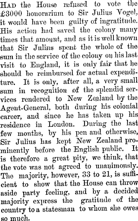 Had tlie House refused to vote the £3OOO honorarium to Sir Julius Vogel, it would have heeu guilty of ingratitude. His action had saved the colony many times that amount, and as it is well known that Sir Julius spent the whole of the sum in the service of the colony on his last visit to England, it is only fair that he should be reimbursed for actual expenditure, It is ouly, after all, a very small sum in recognition of the splendid services rendered to New Zealand by the Agent-General, both during his colonial career, and since he has taken up his residence in Loudon. During the last few months, by his pen and otherwise, Sir Julius has kept New Zealand prominently before the English public. It is therefore a great pity, we think, that the vote was not agreed to unanimously. The majority, howevex 1 , 33 to 21, is sufficient to show that the House can throw aside party feeling, and by a decided majority express the gratitude of the country to a statesman to whom she owes so much.