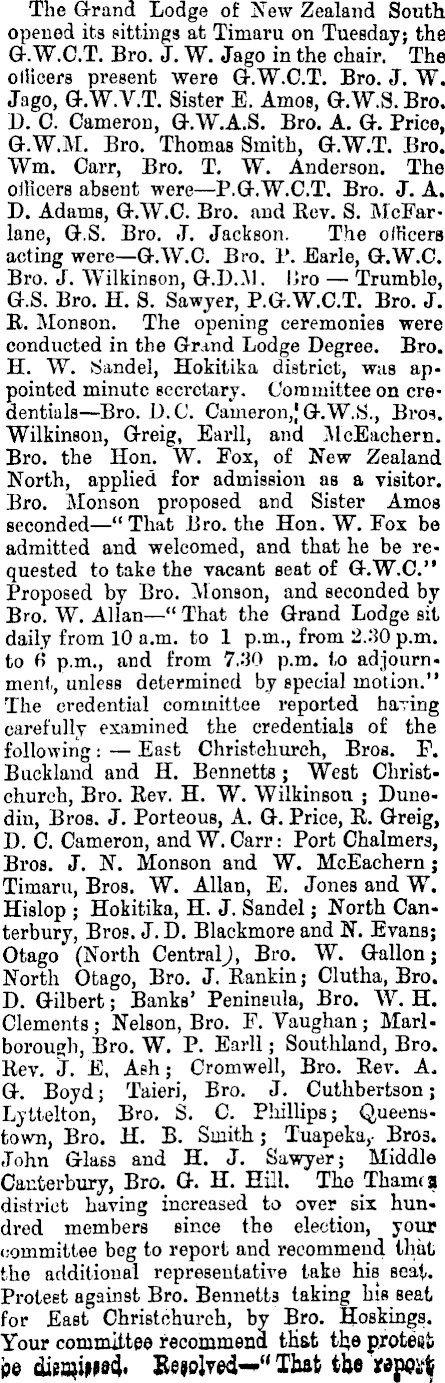 I The Grand Lodge of New Zealand South ! opened its sittings at Timaru on Tuesday; the G.W.C.T. Bro. J. W. Jago in the chair. The ollicers present were G.W.C.T. Bro. J. W. Jago, G.W.V.T. Sister E. Amos, G.W.S. Bro. D. C. Cameron, G.W.A.S. Bro. A. G. Price, G.W.M. Bro. Thomas Smith, G.W.T. Bro. i Wm, Carr, Bro. T. W. Anderson. The I officers absent -were —P.G.W.C.T. Bro. J. A. ; D. Adams, G.W.C. Bro. and Rev. S. McFarlane, G.S. Bro. J. Jackson. The officers acting were—G.W.C. Bro. I'. Earle, G.W.C. Bro. J. Wilkinson, G.D..M. Ijro Trumblo, G.S. Bro. H. S. Sawyer, P.G.W.C.T. Bro. J. | R. Monson. The opening ceremonies were ' conducted in the Grand Lodge Degree. Bro. i H. W. Sandel, Hokitika district, was appointed minute secretary. Committee on credentials—Bro. D.C. Cameron,,'G.W.S., Bros. Wilkinson, Greig, Earll, and McEachern. Bro. the Hon. W. Fox, of New Zealand North, applied for admission as a visitor. Bro. Monson proposed and Sister Amos seconded —"That Bro. the Hon. W. Fox be admitted and welcomed, and that he be requested to take the vacant seat of G.W.C." Proposed by Bro. Monson, and seconded by Bro. W. Allan—" That the Grand Lodge sit daily from 10 a.m. to 1 p.m., from 2..'50 p.m. to fi p.m., and from 7.30 p.m. to adjournment, unless determined by special motion." The credential committee reported having carefully examined the credentials of the following : East Christchurch, Bros. F. Buckland and H. Bennetts; West Christchurch, Bro. Rev. H. W. Wilkinson ; Dunedin, Bros. J. Porteous, A. G. Price, R. Greig, D. C. Cameron, and W. Carr: Port Chalmers, Bros. J. N. Monson and W. McEachern ; Timaru, Bros. W. Allan, E. Jones and W. Hislop ; Hokitika, H. J. Sandel; North Canterbury, Bros. J. D. Blackmore and N. Evans; Otago (North CentralJ, Bro. W. Gallon; North Otago, Bro. J. Rankin; Clutha, Bro. D. Gilbert; Banks' Peninsula, Bro. W. H. Clements; Nelson, Bro. F. Yaughan; Marlborough, Bro. W. P. Earll; Southland, Bro. Rev. J. E, Ash; Cromwell, Bro. Rev. A. G. Boyd; Taieri, Bro. J. Cuthbertson; Lyttelton, Bro. S. C. Phillips; Queenstown, Bro. H. B. Smith; Tuapeka,- Bros. John Glass and H. J. Sawyer; Middle Canterbury, Bro. G. H. Hill. The Than* a district having increased to over six hundred members since the election, your committee beg to report and recommend that the additional representative take his seat. Protest against Bro. Bennetts taking his seat for East Christchurch, by Bro. Hoskings. Your committee recommend that the protest pe di£»W34. Reeolyei—" That fclw »pp;tf