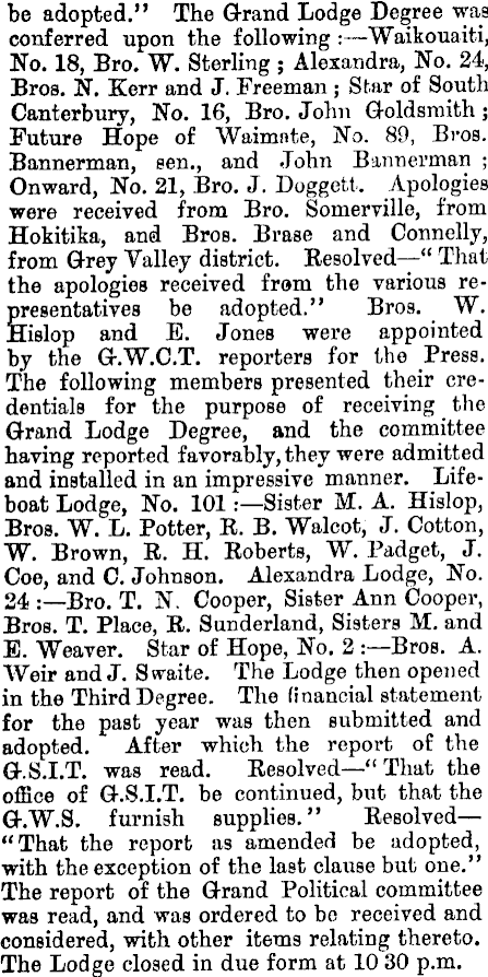 be adopted." The Grand Lodge Degree was conferred upon the following : —Waikouaiti, No. 18, Bro. W. Sterling ; Alexandra, No. 24, Bros. N. Kerr and J. Freeman; Star of South Canterbury, No. 16, Bro. John Goldsmith ; Future Hope of Waimate, No. 89, Bros. Bannerman, sen., and John Bannerman ; Onward, No. 21, Bro. J. Doggett. Apologies were received from Bro. Somerville, from Hokitika, and Bros. Brase and Connelly, from Grey Valley district. Resolved—" That the apologies received from the various representatives be adopted." Bros. W. HMop and E. Jones were appointed by the G.W.C.T. reporters for the Press. The following members presented their credentials for the purpose of receiving the Grand Lodge Degree, and the committee having reported favorably, they were admitted and installed in an impressive manner. Lifeboat Lodge, No. 101 .—Sister M. A. Hislop, Bros. W. L. Potter, R. B. Walcot, J. Cotton, W. Brown, R. H. Roberts, W. Padget, J. Coe, and C. Johnson. Alexandra Lodge, No. 24 : —Bro. T. N. Cooper, Sister Ann Cooper, Bros. T. Place, R. Sunderland, Sisters M. and E. Weaver. Star of Hope, No. 2 :—Bros. A. Weir and J. Swaite. The Lodge then opened in the Third Degree. The financial statement for the past year was then submitted and adopted. After which the report of the G.S.I.T. was read. Resolved—" That the office of G.S.I.T. be continued, but that the G.W.S. furnish supplies." Resolved—- " That the report as amended be adopted, with the exception of the last clause but one." The report of the Grand Political committee was read, and was ordered to be received and considered, with other items relating thereto. The Lodge closed in due form at 10 30 p.m.