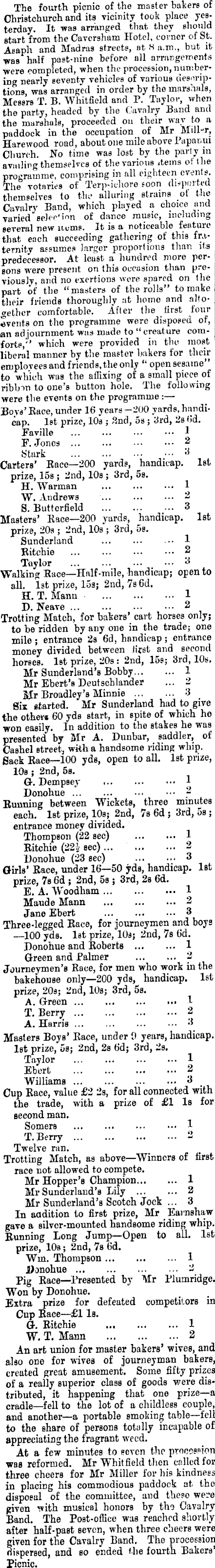 The fourth picnic of the master bakers of Christchurch and its vicinity took place yesterday. It was arranged that they should start from the Cavcrshnm Hotel, corner of St. Asaph and Madras streets, at « a.m., but it was half past-nine before all arrangements were completed, when the procession, numbering nearly seventy vehicles of various descriptions, was arranged in order by the marshals, Messrs T. B. Whitfield and P. Taylor, when the party, headed by the Cavalry Band and the marshals, proceeded on their way to a paddock in the occupation of Mr Mill-r, Harewood road, about one mile above Papar.ui Church. No time was lost by the party in availing themselves of the various items of the programme, comprising in all eighteen events. The votaries of Terp-ichore soon disported themselves to the alluring strains of the Cavalry Band, which played a choice and varied selec'inn of dance music, including several new Hums. It is a noticeable feature that each succeeding gathering of this fraternity assumes larger proportions than its predecessor. At; least a hundred more persons were present on (his occasion than previously, and no exertions were spared on the part of the “masters of the rolls” to make their friends thoroughly at home and altogether comfortable. After the first four events on the programme were disposed of, an adjournment was made to “ creature comforts,'’ which were provided in the most liberal manner by the master bakers for their employees and friends, the only “ open sesame” to which was the affixing of a small piece of ribbon to one’s button hole. The following were the events on the programme:— Boys’ Eace, under 16 years -200 yards, handicap. Ist prize, 10s ; 2nd, os ; 3rd, 2s f>d. Faville ... ... ••• I F. Jones 2 Stark ... ... 3 Carters’ Race—2oo yards, Ist prize, 15s ; 2nd, 10s ; 3rd, ss. H. Warman 1 W. Andrews ... 2 S. Butterfield ... ... 3 Masters’ Race—2oo yards, handicap. Ist prize, 20s ; 2nd, 10s ; 3rd, os. Sunderland 1 Ritchie 2 Tuylor ... ••• 3 Walking Race—Half-mile, handicap; open to all. Ist prize, 15s; 2nd, 7s6d. H. T. Manu 1 D. Neave ... ••• 2 Trotting Match, for bakers’ cart horses only; to be ridden by any one in the trade; one mile ; entrance 2s 6d, handicap; entrance money divided between first and second horses. Ist prize, 20s : 2nd, 15s; 3rd, 10s, Mr Sunderland’s Bobby 1 Mr Ebert’s Deutschlander ... 2 Mr Broadley’s Minnie ... ... 3 Six started. Mr Sunderland had to give the others 60 yds start, in spite of which he won easily. In addition to the stakes he was presented by Mr A. Dunbar, saddler, of Cashel street, with a handsome riding whip. Sack Race—loo yds, open to all. Ist prize, 10s ; 2nd, ss. G. Dempsey ••• I Donohue - Running between Wickets, three minutes each. Ist prize, 10s; 2nd, 7s 6d ; 3rd, 5s ; entrance money divided. Thompson (22 sec) ... ... 1 Ritchie (22i sec) - Donohue (23 sec) 3 Girls’ Race, under 16—50 yds, handicap. Ist prize, 7s 6d ; 2nd, 5s ; 3rd, 2s 6d. E. A. Woodham 1 Maude Mann 2 Jane Ebert 3 Three-legged Race, for journeymen and boys —IOO yds. Ist prize, 10s; 2nd, 7s 6d. Donohue and Roberts 1 Green and Palmer 2 Journeymen’s Race, for men who work in the bakehouse only —200 yds, handicap, Ist prize, 20s; 2nd, 10s; 3rd, ss. A. Green I T. Benyr 2 A. Harris ... 3 Masters Boys’ Race, under 0 years, handicap. Ist prize, se; 2nd, 2s 6d; 3rd, 2s. Taylor 1 Ebert 2 Williams 3 Cup Race, value £2 2s, for all connected with the trade, with a prize of £1 Is for second man. Somers I T. Berry 2 Twelve ran. Trotting Match, as above —Winners of first race not allowed to compete. Mr Hopper’s Champion 1 Mr Sunderland’s Lily 2 Mr Sunderland’s Scotch Jock ... 3 In addition to first prize, Mr Earnshaw gave a silver-mounted handsome riding whip. Running Long Jump—Open to ail. Ist prize, 10s; 2nd, 7s fid. Win. Thompson 1 JJonohue 2 Pig Race—Presented by Mr Plumridge, Won by Donohue. Extra prize for defeated competitors in Cup Eace —£1 Is. G. Ritchie 1 W. T. Mann 2 An art union for master bakers’ wives, and also one for wives of journeyman bakers, created great amusement. Some fifty prizes of a really superior class of goods were distributed, it happening that one prize—a cradle —fell to the lot of a childless couple, and another —a portable smoking table—fell to the share of persons totally incapable of appreciating the fragrant weed. At a few minutes to seven the procession was reformed. Mr Whitfield then called for three cheers for Mr Miller for his kindness in placing his commodious paddock at the disposal of the committee, and these were given with musical honors by the Cavalry Band. The Post-office was reached shortly after half-past seven, when three cheers were given for the Cavalry Band, The procession dispersed, and so ended the fourth Bakers’ Picnic.