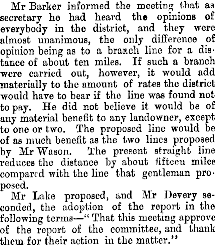 Mr Barker informed the meeting that as secretary he had heard the opinions of everybody in the district, and they were almost unanimous, the only difference of opinion being as to a branch line for a distance of about ten miles. If such a branch were carried out, however, it would add materially to the amount of rates the district would have to bear if the line was found not to pay. He did not believe it would be of any material benefit to any landowner, except to one or two. The proposed line would be of as much benefit as the two lines proposed by MrWason. The present straight line reduces the distance by about fifteen miles compared with the line that gentleman proposed. Mr Lake proposed, and Mr Devery seconded, the adoption of the report in the following terms—" That this meeting approve of the report of the committee, and thank them for their action in the matter."