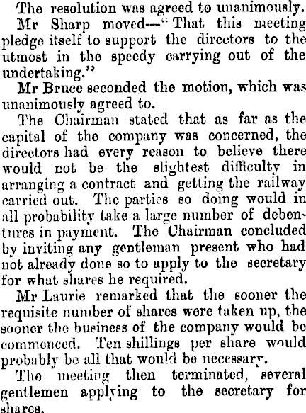 The resolution was agreed to unanimously. Mr Sharp moved—" That this meeting pledge itself to support the directors to the utmost in the speedy carrying out of the undertaking." Mr Bruce seconded the motion, which was unanimously agreed to. The Chairman stated that as far as the capital of the company was concerned, the directors had every reason to believe there would not be the slightest difficulty in arranging a contract and getting the railway carried out. The parties so doing would in all probability take a large number of debentures in payment. The Chairman concluded by inviting any gentleman present who had not already done so to apply to the secretary for what shares he required. Mr Laurie remarked that the sooner the requisite number of shares were taken up, the sooner the business of the company would be commenced. Ten shillings per share would probably bo all that would be necessary. The meeting then terminated, several gentlemen applying to the secretary for shares.