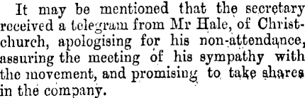It may he mentioned that the secretary received a telegram from Mr Hale, of Christchurch, apologising for his non-attendance, assuring the meeting of his sympathy with the movement, and promising to take shares in the company. '