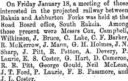 On Friday January 18, a meeting of those interested in the projected railway between Rakaia and Ashburton Forks was held at t,he Koad Board office, South Rakaia. Among those present were Messrs Cox, Campbell, Wilkinson, J. Bruce, 0. Lake, C. F. Barker, R. MoKerrow, J. Mann, G. H. Holmes, J. N. Sharp, J. Pitt, R. Patton, A. Devery, P. Laurie, E. S. Coster, G. Hart, D. Cameron, R. R. Pitt, George Gould, Neil McLean, J. T. Ford, P. Laurie, F. B. Passmore, and J. L. Coster.