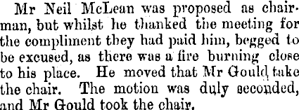 Mr Neil McLean was proposed as chairman, but whilst he thanked the meeting for the compliment they had paid him, begged to be excused, as there was a fire burning close to bis place. He moved that Mr Gould, take the chair. The motion was duly (seconded, and Mr Gould took the chair.