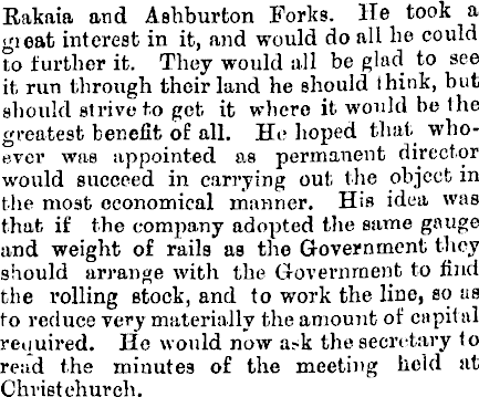 Rakaia and Ashburton Forks. He took a gieat interest in it, and would do all he could to further it. They would all be glad to see it run through their land he should think, but should strive to get it where it would be the greatest benefit of all. He hoped that whoever was appointed as permanent director would succeed in carrying out the object in the most economical manner. His idea was that if the company adopted the same gauge and weight of rails as the Government they should arrange with the Government to find the rolling stock, and to work the line, so as to reduce very materially the amount of capital required. He would now a?k the secretary to read the minutes of the meeting held at Christ church.