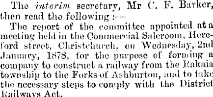 The interim, secretary, Mr C. F. Barker, then read the following :- The report of the committee appointed at a meeting held in the Commercial Saleroom, Hereford street, Christchureh. en Wednesday, 2nd January, 1878, tor the purpose of forming a company to construct a railway from the h'akaia township to the Forks of Ashburton, and to take the necessary steps to comply with the District Railways Act.