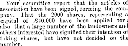 Vour committee report that the artcles of association have boon signed, forming the company. That the 2000 shares, representing a capital of .£40.000 have heen applied for: also that a large number of the landowners and others interested have signilied their intention of taking- shares, but have not decided on the number.
