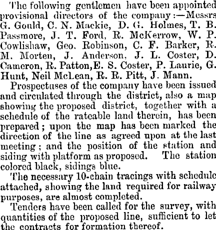 The following gentlemen have been appointed provisional directors of the company:—Messrs G. Gould, C. N. Mackie, D. G. Holmes, T. B. Passmore, J. T. Ford, R. McKerrow, W. P. Cowlishaw, Geo. Robinson, C. F. Barker, R. M. Morten, J. Anderson. J. L. Coster, D. Cameron, R. Patton,E. S. Coster, P. Laurie, G. Hunt, Neil McLean, R. R. Pitt, J. Mann. Prospectuses of the company have been issued and circulated through the district, also a map showing the proposed district, together with a schedule of the rateable land therein, has been prepared; upon the map has been marked the direction of the line as agreed upon at the last meeting ; and the position of the station and siding with platform as proposed. The station colored black, sidings blue. The necessary 10-chain tracings with schedule attached, showing the land required for railway purposes, are almost completed. Tenders have been called for the survey, with epiantities of the proposed line, sufficient to let the contracts for formation thereof.