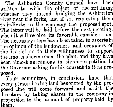 The Ashburton County Council have been written to with the object of ascertaining whether they intend bridging the Ashburton river near the forks, and if so, requesting them to indie ite to the company the proposed spot. The letter will be laid before the next meeting, when it will receive its favorable consideration The necessary steps have been taken to ascertain the opinion of the landowners and occupiers of the district as to their willingness to support the lino as shown upon the plan, and they have been almost unanimous in signing a petition to the Governor asking for his consent to it as proposed. Your committee, in conclusion, hope that every person having land benefitted by the proposed line will come forward and assist the directors by taking shares in the company in proportion to the amount of property held by them.