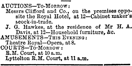 AUCTIONS— To-Morrow : Messrs Clifford and Co., on the premises opposite the Royal Hotel, at 12—Cabinet maker’s seock-in-trade. J. G. Hawkes, at the residence of Mr H. A. Davis, at 12—Household furniture, &c. AMUSEMENTS-Tms Evening: Theatre Royal—Opera, at 8. COURTS— To-Morrow : R.M. Court, at 10a.m. Lyttelton R.M. Court, at 11 a.m.