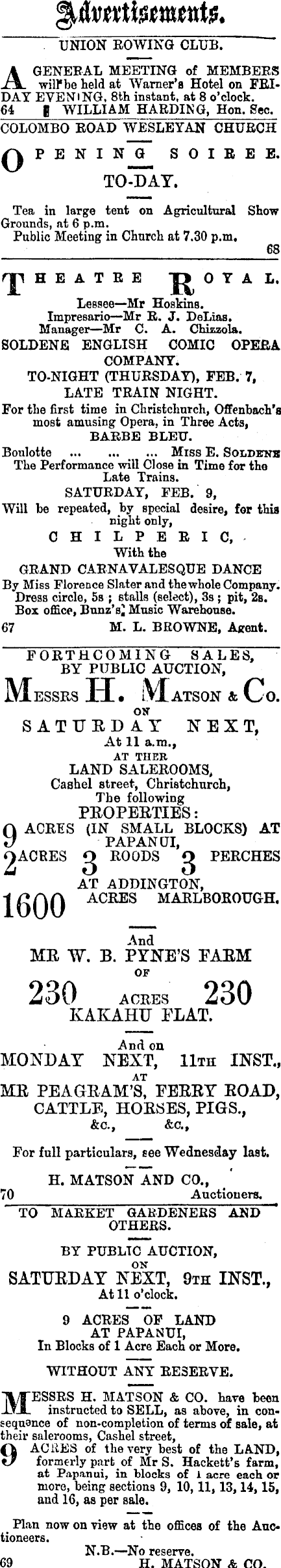 UNION BOWING CLUB. A GENERAL MEETING of MEMBERS will"be held at Warner’s Hotel on FRIDAY EVENING, Bth instant, at 8 o’clock. 64 B WILLIAM HARDING, Hon. Sec. COLOMBO ROAD WESLEYAN CHURCH QPENING SOIREE. to3at. Tea in large tent on Agricultural Show Grounds, at 6 p.m. Public Meeting in Church at 7.30 p.m. fjl HEA TE E jjj OTA L. Lessee—Mr Hoskins. Impresario —Mr E. J. DeLias. Manager—Mr C. A. Chizzola. BOLDENE ENGLISH COMIC OPERA COMPANY. TO-NIGHT (THURSDAY), FEB. 7, LATE TRAIN NIGHT. For the first time in Christchurch, Offenbach’s most amusing Opera, in Three Acts, BAEBE BLEU. Boulotte ... Miss E. Soldenb The Performance will Close in Time for the Late Trains. SATURDA.Y, FEB. 9, Will be repeated, by special desire, for this night only, CHILPERIC, With the GRAND CARNAVALESQUE DANCE By Miss Florence Slater and the whole Company, Dress circle, 5s ; stalls (select), 3s ; pit, 2b. Box office, Bnnz’s’ Music Warehouse. 67 M. L. BROWNE, Agent. FORTHCOMING SALES, BY PUBLIC AUCTION, M ESSRS H. VI ATSON * Co. 9 on SATURDAY NEXT, At 11 a.m., AT TIIER LAND SALEROOMS, Cashel street, Christchurch, The following PROPERTIES: ACRES (IN SMALL BLOCKS) PAPANUI, CJ ROODS 0 PERCHES AT ADDINGTON, ACRES MARLBOROUGH. AT f)ACRES 1600 And MR W. B. PYNE’S EAEM OF 230 acres 230 KAKAHU ELAT. And on MONDAY NEXT, 11th INST., AT MR PEA GRAM’S, FERRY ROAD, CATTLE, HORSES, PIGS., &c., &c.. For full particulars, see Wednesday last. H. MATSON AND CO., 70 Auctiouers. TO MARKET GARDENERS AND OTHERS. BY PUBLIC AUCTION, ON SATURDAY NEXT, 9th INST., At 11 o’clock. 9 ACRES OF LAND AT PAPANUI, In Blocks of 1 Acre Each or More. WITHOUT ANY RESERVE. MESSRS H. MATSON & CO. have been instructed to SELL, as above, in consequence of non-completion of terms of sale, at their salerooms, Cashel street, 9 AC RES of the very best of the LAND, formerly part _of Mr S. Hackett’s farm, at Papanui, in blocks of i acre each or more, being sections 9, 10,11, 13,14,15, and 16, as per sale. Plan now on view at the offices of the Auctioneers. N.B.—No reserve. 69 H. MATSON & CO.