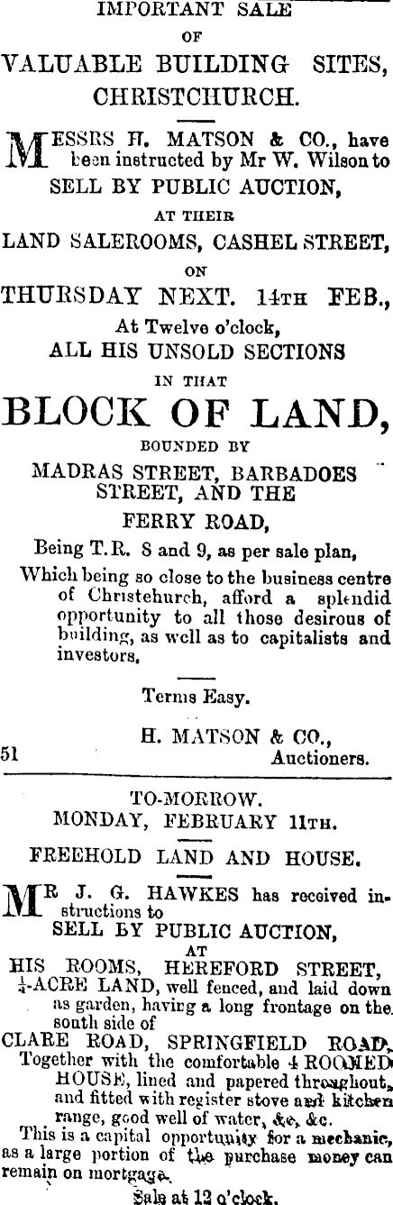 IMPORTANT SALE OF VALUABLE BUILDING SITES, CHRISTCHURCH. Messrs f. matson & co., have Leon instructed by Mr W. Wilson to SELL BY PUBLIC AUCTION, AT THEIR LAND SALEROOMS, CASHEL STREET, ON THURSDAY NEXT. 11th FEB., At Twelve o’clock, ALL HIS UNSOLD SECTIONS IN THAT BLOCK OF LAND, BOUNDED BV MADRAS STREET, BARBADOES STREET, AND THE FERRY ROAD, Being T.R. S and 9, as per sale plan, Which being so close to the business centre of Christchurch, afford a splendid opportunity to all those desirous of building, as well as to capitalists and investors. Terms Easy. H. MATSON ft CO., 51 Auctioners. TO-MORROW. MONDAY, FEBRUARY 11th. FREEHOLD LAND AND HOUSE. MR J. G. HAWKES has received in. structions to SELL BY PUBLIC AUCTION, AT HIS ROOMS, HEREFORD STREET, 4-ACRE LAND, well fenced, and laid down as garden, having a long frontage on the, south side of CLARE ROAD, SPRINGFIELD ROAD. Together with the comfortable 4 ROOMED* HOUSE, lined and papered throughout, and fitted with register stove asd kitchen range, good well of water, &c. This is a capital opportunity for a mechanic, as a large portion of the purchase money can remain on mortgage^ Sals at 13 o’clock.