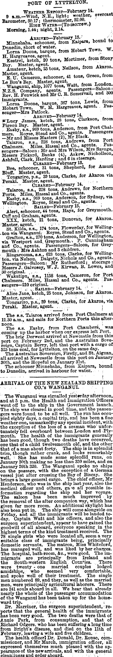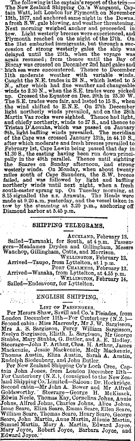 The following is the captain's report of the trip:— The New Zealand Shipping Co.'s Wanganui, Captain Watt, left London for Plymonth on November 13th, 1877, and anchored same night in the Downs, a fresh S. W. gale blowing, and weather threatening. Next morning weighed anchor and proceeded in tow. Light westerly breezes were experienced, and Plymouth reached on the night of the 17th. On the 21st embarked immigrants, but through a succession of strong westerly gales the ship was delayed until the 25th, when the voyage was again resumed; from thence until the Bay of Biscay was crossed on December 2nd hard gales and high sea were encountered. Thence to December 11th moderate weather with variable winds. Caught the N.E. trades in 28 N., which lasted to 5 N., after which had fine weather and changeable winds to 2.30 N., when the S.E. trades were picked up. Crossed the Equator on Dec. 20th in 25.30 W. The S.E. trades were fair, and lasted to 15 S., when the wind shifted to E.N.E. On 27th December light northerly winds prevailed, and on the 28th Martin Vaz rocks were sighted. Thence had light, and chiefly northerly, winds to 27 S., and thence to Tristan D'Acunha, which was passed on January 9fch, light baffling winds prevailed. The meridian of the Cape was crossed January 13th, in 44.10 S., after which moderate and fresh breezes prevailed to .February Ist, Cape Lewin being passed that day in 51.30 S., the easting having been run down principally in the 49th parallel. Thence until sighting the Snares on Sunday afternoon., had strong westerly winds. On Monday, when about twenty miles south of Cape Saunders, the S.W. breeze failed, and was followed by light and baffling northerly winds until next night, when a fresh south-easter sprang up. On Tuesday morning, at 8.15 signalled the s.s. Arawata. The Heads were made at 9.20 a.m. yesterday, and the vessel taken in tow by the steamtug at 3.20 p.m., anohoring off Diamond harbor at 5.45 p.m. SHIPPING TELEGBAMS. Auckland, I'obrnary 13. Sailed—Taranaki, for South, at 4 p.m. Passengers—Meadames Dryden and Gillingham, Messrs Wauchop, Gillingham, Cntts, and Morrison. Wellington, February 13. Arrived —Taupo, from Lyttelton, at 1 p.m. Port Chalmers, February 13. Arrived—Wanaka, from Lyttelton, at 4.55 p.m. Wellington, February 14. Sailed—Endeavour, for Lyttelton. ENGLISH SHIPPING. List of Passengers. Per Messrs Shaw, Savill and Co.'s Pleiades, from London December 11th—For Canterbury (N.Z.)— Soiond cabin: Miss Macrcady, Mr J. W. Sargisson, Mrs A. S. Sargisson, Percy William Sargisson, Evelyn Sargisson, Elizth. L. Sargisson, Mr George Stubbs, Mary Stnbbs, G. Butler, and A. E. Hadley. Steerage—John P. Arthur, Chas. H. Arthur, James Mackenzie, Jessie Mackenzie, Molly Mackenzie, Thomas Austin, Eliza Austin, S:irah A. Austin! Rudolph Siedenbnrg, and John Butler. Per New Zealand Shipping Co's Loch Cree, Captain John Jones, from Loudon December 12th— For Canterbury (N.Z.), (consigned to the New Zealand ShippingCo.'Limited—Saloon: Dr. HockriSge. Second cabin—Mr John A. Bower and Mr Alfred Goldsworthy. Steerage—George H. McKisack, Edwin Noele, Thomas Kay, Cornelius Johns, Annie Johns, Alfred Johns, Charles Johns, Alice Johns, Ismic Seare, Eliza Seore, Emma Scare, Ellen Scare, William Seare, Thomas Seare, Henry Searo, George Seare, John Martin, Anne Martin, .Minnie Martin, Samuel Martin, Mary A. Martin, Edward Joyce, Mary Joyce, Bobert Joyce, Barbara Joyce, and Edward Joyce.