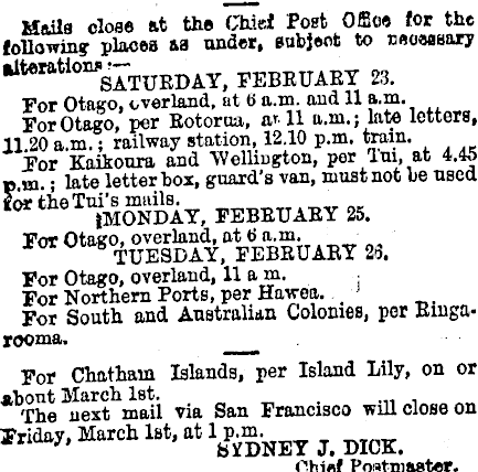 Mails close at the Chid Post Office for the following plaoea na under, subject to tmoeaaary ritmtIOT *SATURDAY, FEBRUARY 23. For Otago, overland, ut 6 a.m. and 11 a.m. ForOtago, per Rotorna, a'll a.m.; late letters, 11 20 a.m.; railway station, 12.10 p.m. tram. For Kaikoura and Wellington, per lui, at 4.45 n.va. ; late letterbox, guard's van, must not be used for the Tui's mails. „ „ {MONDAY, FEBRUARY 25. For Otago, overland, at tJ a.m. * 8 TUESDAY, FEBRUARY 26. For Otago, overland, 11 a m. For Northern Ports, per Hawea. For South and Australian Colonies, per Ringarooma. Por Chatham Islands, per Island Lily, on or about March Ist. The next mail via San Francisco will close on Friday, March l ß t, at r Chief Postmaster.