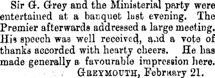 Sir G. Grey and the Ministerial party were entertained at a banquet last evening. The Premier afterwards addressed a large meeting. His speech was well received, a.id a vote of thanks accorded with hearty cheers. He has made generally a favourable impression here. Gbevmouth, February 21.