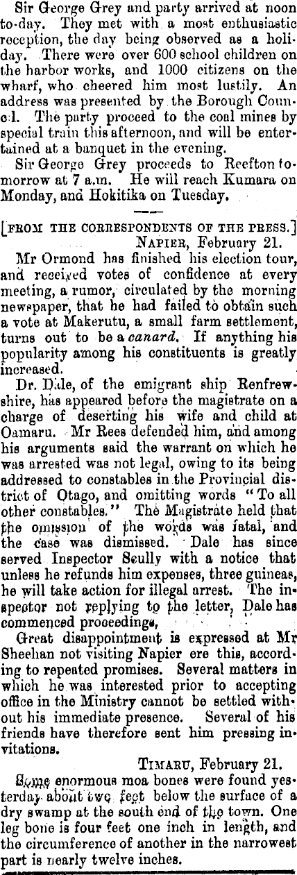 Sir Q-eorge Grey and party arrived at noon to-day. They met with a most enthusiastic reception, the day being observed as a holiday. There were over 600 school children on the harbor works, and 1000 citizens on the wharf, who cheered him most lustily. An address was presented by the Borough Couno:l. The party proceed to the coal mines by special train this afternoon, and will be entertained at a banquet in the evening. Sir George Grey proceeds to Reefton tomorrow at 7 a.m. He will reach Kumara on Monday, and Hokitika on Tuesday. [PBOJI THE COEEESPONDENTS OF THE PEESS.] Napier, February 21. Mr Ormond has finished his election tour, and received votes of confidence at every meeting, a rumor, circulated by the morning newspaper, that he had failed to obtain such a vote at Makerutu, a small farm settlement, turns out to be a canard. If anything his popularity among his constituents is greatly increased. Dr. Dale, of the emigrant ship Renfrewshire, has appeared before the magistrate on a charge of deserting his wife and child at Oamaru. Mr Rees defended him, and among his arguments said the warrant on which he waß arrested was not legal, owing to its being addressed to constables in the Provincial district of Otago, and omitting words "To all other constables." The Magistrate held that f;he omittsion of the words was fatal, and the case was dismissed. Dale has since served Inspector Seully with a notice that unless he refunds him expenses, three guineas, he will take action for illegal arrest. The inepeotor not replying tp fhe letter, Dale has commenced prooeedingu, G-reat disappointment is expressed at Mr Sheehan not visiting Napier ere this, according to repeated promises. Several matters in which he was interested prior to accepting office in the Ministry cannot be settled without his immediate presence. Several of his friends have therefore sent him pressing invitations. TniABF, February 21. S&mtf enormous moa bones were found yesterday about two, feet below the surface of a dry swamp at the south end. of thp town. One leg bone is four feet one inch in length, and the circumference of another in the narrowest part is nearly twelve inches. —■'" .;.,r "