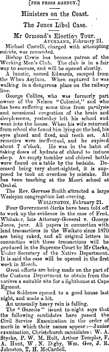 [PEB PBEBB AGENCY.] Ministers on the Coast. The Jones Libel Case. Mr Ormond's Election Tour. Auckland, February 21. Michael Costclli, charged with attempting suicide, was remanded. Bishop Cowie lias become patron of the Working Men's Club. The club is in a fair way to success, and will be opened shortly. A lunatic, named Edwards, escaped from the Whau Asylum. When captured he was walking in a dangerous place on the railway line. George Collins, who was formerly part owner of the Nelson "Colonist," and who has been suffering some time from paralysis and occasional congestion of the brain and sleeplessness, yesterday left his school and went into the house. When his wife returned from school she found him lying on the bed, his eyes glazed and fixed, and teeth Bet. All remedies were ineffectual, and he expired about 7 o'clock, lie was in the habit of taking doses of hydrate of chloral to induce sleep. An empty tumbler and chloral bottle were found on a table by the bedside. Deceased being very short-sighted, it is supposed he took an overdose by mistake. He has been teaching at the Maori sehool at Orakei. The Rev. Gervase Smith attracted a large Wesleyan congregation last evening. Wellington, February 21. Four G-overnment clerks have been told off to work up the evidence in the case of Fred. Whitakir, late Attorney-General v. George Jones, junr. All papers in connection with land transactions in the Waikato since 1870 are being raked, and all original letters in connection with these transactions will be produced in the Supreme Court by Mr Clarke, Under Secretary of the Native Department. It is said the case will be opened in the first we»k in March. Great efforts are being made on the part of the Customs Department to obtain from the natives a suitable site for a lighthouse at Cape Egmont. The Soldenes opened to a good house last night, and made a hit. An unusually heavy rain is falling. The " Gazette " issued to-night says that the following candidates have passed the Civil Service Examination in the order of merit in which their names appear:—Junior examination, Christchurch candidates : W. A. Stycke, P. W. M. Holt, Arthur Templar, F. A. Hunt, W . N. Digby, Wm. Gee, J. R. Johnston, T. H. McCardell.