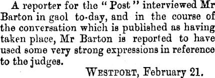 A reporter for the " Post" interviewed Mr Barton in gaol to-day, and in the course of the conversation which is published as having taken place, Mr Barton is reported to have used some very strong expressions in reference to the judges. Westpobt, February 21.
