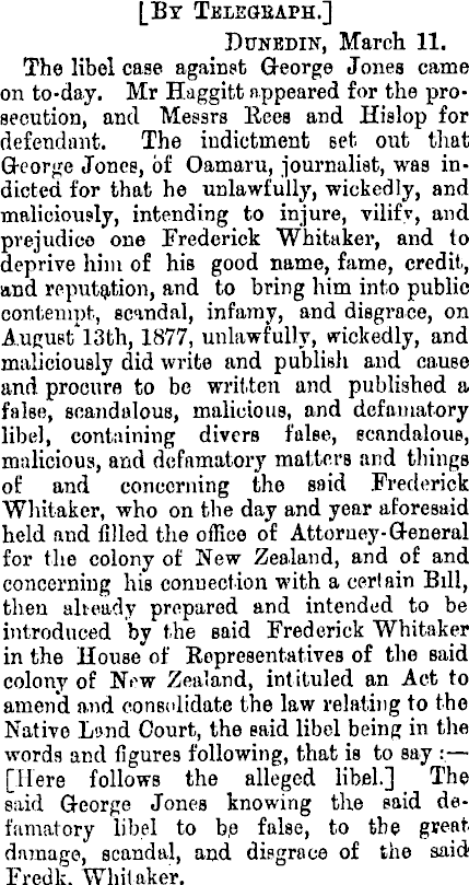 [By Telegeaph.] Dunedin, March 11, The libel case against George Jones came on to-day. Mr Haggitt appeared for the prosecution, and Messrs Bees and Hislop for defendant. Tho indictment set out that George Jones, of Oamaru, journalist, was indicted for that he unlawfully, wickedly, and maliciously, intending to injure, vilify, and prejudice one Frederick Whitaker, and to deprive him of his good name, fame, credit., and reputation, and to bring him into public contempt, scandal, infamy, and disgrace, on August" 13th, 1877, unlawfully, wickedly, and maliciously did write and publish and cause and procure to be written and published a false, scandalous, malicious, and defamatory libel, containing divers false, scandalous, malicious, and defamatory matters and things of and concerning the said Frederick Whitaker, who on the day and year aforesaid held and filled the office of Attorney-General for the colony of New Zealand, and of and concerning his connection with a certain Bill, then already prepared and intended to be introduced by the said Frederick Whitaker in the House of Representatives of the said colony of New Zealand, intituled an Act to amend and consolidate the law relating to the Native Lund Court, the said libel being in the words and figures following, that is to say ; [Here follows the alleged libel.] The said George Jones knowing the said defamatory libel to be false, to the great damage, scandal, and disgrace of the said Fredk. Whitaker.