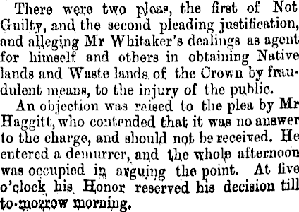 There wore two pjoas, the first of Hot Guilty, and the second pleading Justification, and alleging Mr Whitaker’s dealings as agent for himself and others in obtaining Native lands and Waste lands of the Crown by fraudulent means, to the injury of the public. An objection was raised to the plea by Mr Haggitt, who contended that it was no answer to the charge, and should npt be received. He entered a demurrer, and the whole afternoon was occupied ip arguing the point. At five o’clock his Honor reserved bis decision till morning.