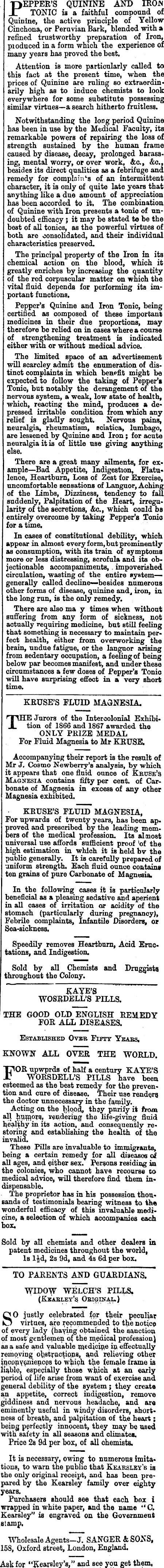 [ TAPPER'S quinine and iron Jr TONIC is a faithful compound of ; Quinine, the active principle of Yellow 1 Cinchona, or Peruvian Bark, blended with a 1 refined trustworthy preparation of Iron, • pioduced in a form which the experience of : many years has proved the best. Attention is more particularly called to i this fact at the present time, when the prices of Quinine are ruling so extraordinarily high as to induce chemists to look ' everywhere for some substitute possessing I similar virtues—a search hitherto fruitless. b i Notwithstanding the long period Quinine ' has been in use by the Medical Faculty, its i remarkable powers of repairing the loss of ■ strength sustained by the human frame caused by disease, decay, prolonged harassi ing, mental worry, or over work, <kc., &c., besides its direct qualities as a febrifuge and ■ remedy for complain ‘■3 of an intermittent character, it is only of quite late years that anything like a due amount of appreciation has been accorded to it. The combination of Quinine with Iron presents a tonic of un--1 doubted efficacy; it may be stated to be the 1 best of all tonics, as the powerful virtues of both are consolidated, and their individual characteristics preserved. The principal property of the Iron in its I chemical action on the blood, which it • greatly enriches by increasing the quantity 1 of the red corpuscular matter on which the • vital fluid depends for performing its important functions. Pepper’s Quinine and Iron Tonic, being ( certified as composed of these important . medicines in their due proportions, may therefore be relied on in cases where a course of strengthening treatment is indicated either with or without medical advice. The limited space of an advertisement will scarcley admit the enumeration of distinct complaints in which benefit might be expected to follow the taking of Pepper’s Tonic, but notably the derangement of the nervous system, a weak, low state of health, which, reacting the mind, produces a depressed irritable condition from which any relief is gladly sought. Nervous pains, neuralgia, rheumatism, sciatica, lumbago, are lessened by Quinine and Iron ; for acute neuralgia it is of little use giving anything else. There are a great many ailments, for example—Bad Appetite, Indigestion, Flatu- ( lence, Heartburn, Loss of Zest for Exercise, ! uncomfortable sensations of Languor, Aching of the Limbs, Dizziness, tendency to faU suddenly. Palpitation of the Heart, irregularity of the secretions, &c., which could bs entirely overcome by taking Pepper’s Tonic for a time. In cases of constitutional debility, which appear in almost every form, but prominently as consumption, with its train of symptoms more or less distressing, scrofula and its objectionable accompaniments, impoverished circulation, wasting of the entire system—generally called decline—-besides numerous other forms of disease, quinine and, iron, in the long run, is the only remedy. There are also ma y times when without suffering from any form of sickness, not actually requiring medicine, but still feeling that something is necessary to maintain perfect health, either from overworking the brain, undue fatigue, or the languor arising from sedentary occupation, a feeling of being below par becomes manifest, and under these circumstances a few doses of Pepper’s Tonic will have surprising effect in a very short time. KRUSE’S FLUID MAGNESIA. THE Jurors of the Intercolonial Exhibition of 1866 and 1867 awarded the ONLY PRIZE MEDAL For Fluid Magnesia to Mr KRUSE. Accompanying their report is the result of Mr J, Cosmo Newberry’s analysis, by which it appears that one fluid ounce of Kruse’s Magnesia, contains fifty per cent, of Carbonate of Magnesia in excess of any other Magnesia exhibited, KRUSE’S FLUID MAGNESIA, For upwards of twenty years, has been apE roved and prescribed by the leading memers of the medical profession. Its almost universal use affords sufficient proof 'of the high estimation in which it is held bv the public generally. It is carefully prepared of uniform strength. Each fluid ounce contains ten grains of pure Carbonate of Magnesia. In the following cases it is particularly beneficial as a pleasing sedative and aperient in all cases of irritation or acidity of the stomach (particularly during pregnancy), Febrile complaints, Infantile Disorders, or Sea-sickness. Speedily removes Heartburn, Acid Eructations, and Indigestion. Sold by all Chemists and Druggists throughout the Colony. KAYE’S ~ WOSRDELL’S PILLS. THE GOOD OLD ENGLISH REMEDY FOR ALL DISEASES. Established Over Fifty Years. KNOWN ALL OYER THE WORLD. FOR upwprds of half a century KAYE’S WORSDELL’S PILLS have been esteemed as the best remedy for the prevention and cure of disease. Their use renders the doctor unnecessary in the family. Acting on the bipod, they purify it from all rendering the life-giving fluid healthy in its action, and consequently restoring and establishing the health of the invalid. These Pills are invaluable to immigrants, being a certain remedy for all diseases of all ages, and either sex. Persons residing in the colonies, who cannot have recourse to medical advice, will therefore find them indispensable. The proprietor has in his possession thousands of testimonials bearing witness to the wonderful efficacy of this invaluable medicine, a selection of which accompanies each box. Sold by all chemists and other dealers in patent medicines throughout the world, Is lid, 2s 9d, and 4s 6d per box. TO PARENTS AND GUARDIANS. WIDOW WELCH’S PILLS. (Kkarley’s Original.) SO justly celebrated for their peculiar virtues, are repommended to the notice of every lady (haying obtained the sanction of most gentlemen of the medical profession) as a safe and valuable medicine in effectually removing obstructions, and relieving other inconyomences to which the female frame la liable, especially those which at an early period of life arise fro