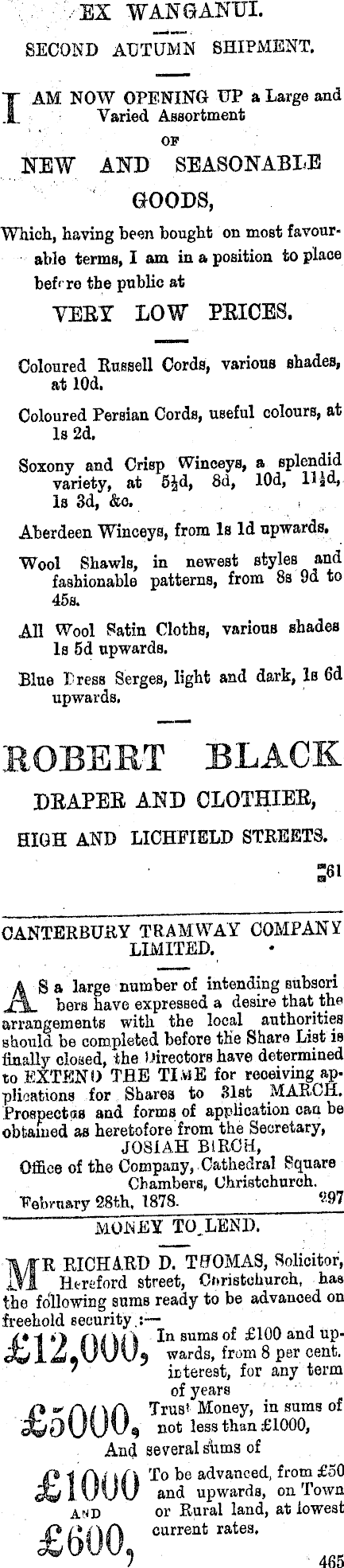 ' EX WANGANUI. SECOND AUTUMN SHIPMENT. I AM NOW OPENING UP a Large and Varied Assortment OF NEW AND SEASONABLE GOODS, Which, having been bought on most favourable terms, I am in a position to place bef< re the public at YERY LOW PRICES. Coloured Russell Cords, various shades, at lOd. Coloured Persian Cords, useful colours, at Is 2d, Soxony and Crisp Winceys, a splendid variety, at Is 3d, &c. Aberdeen Winceys, from Is Id upwards. Wool Shawls, in newest styles and fashionable patterns, from 8a 9d to 455. All Wool Satin Cloths, various shades Is 5d upwards. Blue Press Serges, light and dark, Is 6d upwards, ROBERT BLACK DRAPER AND CLOTHIER, HIGH AND LICHFIELD STREETS. CANTERBURY TRAMWAY COMPANY LIMITED. Ag a large number of intending subacri XjL bers have expressed a desire that the arrangements with the local authorities should be completed before the Share List is finally closed, the Directors have determined to EXTEND THE TIME for receiving applications for Shares to 31st MARCH. Prospect G 8 and forms of application can be obtained as heretofore from the Secretary, JOSIAH BIRCH, Office of the Company, Cathedral Square Chambers, Christchurch. February 98th, 1878- ‘'97 " money to LENIX Mr RICHARD D. THOMAS, Solicitor, Hereford street, Christchurch, has :he following sums ready to be advanced on xeehold security,:— „ In sums of £IOO and upwards, from 8 per cent, interest, for any term of years Trust Money, in sums of not less than £IOOO, £12,000, £SOOO, And several sums of £IOOO AND £6OO To be advanced, from £SO and upwards, on Town or Rural land, at lowest current rates. 465