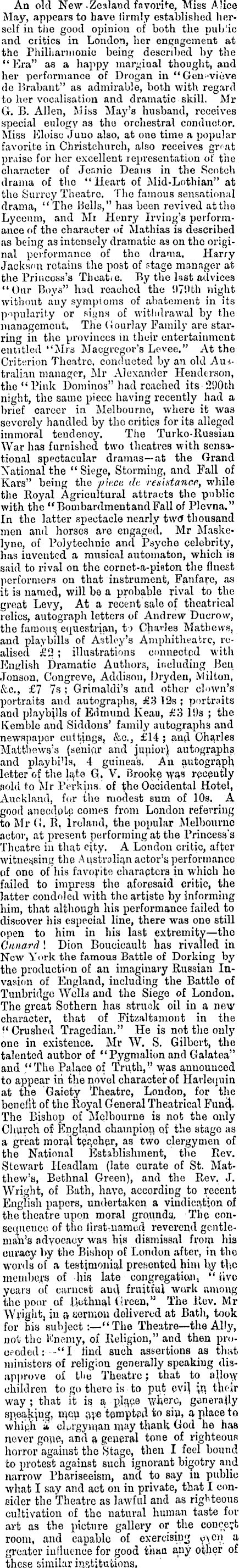 An old New .Zealand favorite, Miss Alice May, appears to have firmly established herself in the good opinion of both the pub'ic and critics in London, her engagement at the Philharmonic being described by the " Era" as a happy marginal thought, and her performance of Drogan in "Genevieve do Brabant" as admirable, both with regard to her vocalisation and dramatic skill. Mr G. B. Allen, Miss May's husband, receives special eulogy as the orchestral conductor. Miss Kloiso Juno also, at one time a popular favorite in Christehurch, also receives gr< at praise for her excellent representation of the character of Jennie Deans in the Scotch drama of the "Heart of Mid-Lothian" at the Surrey Theatre. The famous sensational drama, " The Bells," has been revived at the Lyceum, and Mr Henry Irving's performance of the character of Mathias is described as being as intensely dramatic as on the original performance of the drama. Harry Jackson retains the post of stage manager at the Princess's Thoatie. By the last advices "Our Boys" had reached the 979th night without any symptoms of abatement in its popularity or signs of withdrawal by the management. The Gourlay Family are star* ring in the provinces in their entertainment entitled "Mrs Macgregor's Levee." At the Criterion Theatre, conducted by an old Australian manager, Mr Alexander Henderson, the " Pink Dominos'" had reached its 290th night, the same piece having recently had a brief career in Melbourne, where it was severely handled by the critics for its alleged immoral tendency. The Turko-Russian War has furnished two theatres with sensational spectacular dramas—at the Grand National the " Siege, Storming, and Fall of Kars" being the piece dr. rexhtance, while the Royal Agricultural attracts the public with the "Bombardment and Fall of Plevna." In the latter spectacle nearly two* thousand men and horses are engaged. Mr Maskelyne, of Polytechnic and Psyche celebrity, has invented a musical automaton, which is said to rival on the cornet-a-piaton the finest performers on that instrument, Fanfare, as it is named, will be a probable rival to the great Levy, At a recent sale of theatrical relics, autograph letters of Andrew Ducrow, the famous; equestrian, t> Charles Mathews, and playbills of Astley's Amphitheatre, realised £2 ; illustrations connected with English Dramatic Authors, including Ben Jonson, Congreve, Addison, Dryden, Milton, itc., £7 7s : Grimaldi's and other clown's portraits and autographs, £3 12s ; portraits and playbills of Edmund Keau, £ll l!)s ; the Kemble and Siddons' family autographs and newspaper cuttings, &c., £l4 ; and Charles Matthews's (senior and junior) autographs and playbi'ls, 4 guinea's. An autograph letter of the late G. V. Brooke was receutly sold to Mr Perkins, of sho Occidental Hotel, Auckland, for the modest sum of 10s. A good anecdoLe comes from London referring to Mr (!. Pi. Ireland, the popular Melbourne actor, at present performing at the Princess's Theatre in that city. A London critic, after witnessing the Australian actor's performance of one of his favorite characters in which he failed to impress the aforesaid critic, the latter condoled with the artiste by informing him, that although his performance failed to discover his especial line, there was one still open to him in his last extremity—the Cunard ! Dion Boucicault has rivalled in New York the famous Battle of Dorking by the production of an imaginary Russian Invasion of England, including the Battle of Tunbridge Wells and the Siege of London. The great Sothern has struck oil in a new character, that of Fitzaltamont in the "Crushed Tragedian." He is not the only one in existence. Mr W. S. Gilbert, the talented author of "Pygmalion and Galatea" and "The Palace of Truth," was announced to appear in the novel character of Harlequin at the Gaiety Theatre, London, for the benefit of the Royal General Theatrical Fund;. The Bishop of Melbourne is not the only Church of England champion of the stage as a great moral teacher, as two clergymen of the National Establishment, the Rev. Stewart Headlam (late curate of St. Matthew's, Bethnal Green), and the Rev. J. Wright, of Bath, have, according to recent English papers, undertaken a vindication of the theatre upon moral gro.unda. The consequence of the iirst named reverend gentleman's advocacy was his dismissal from his curacy by the Bishop of London after, in the words of a testimonial presented him by the members of bid late congregation, " Jive years of earnest and, fruitful work among the poor of B.ethnal Green," The Rev. Mr Wright, in ft sermon delivered at Bath, took for his subject :—" The Theatre—the Ally, not the Knemy, of Religion," and then proceeded: "I find such assertions as that ministers of religion generally speaking disapprove of the Theatre; that to ailow children to go there is to put cyi} in their way ; that it is a place where, generally speaking, men aje tempted to sin, a place to which a clergyman may thank ho has never gope, and a general tone of righteous horror against the Stage, then I feel bound to protest against such ignorant bigotry and narrow Phariseeism, and to say in public what I say and act on in private, that I consider the Theatre as lawful and as righteous cultivation of the natural human taste for art as the picture gallery or the concejt room, and capable of exercising byen a greater influence for good than, any oilier of these similar institutions,