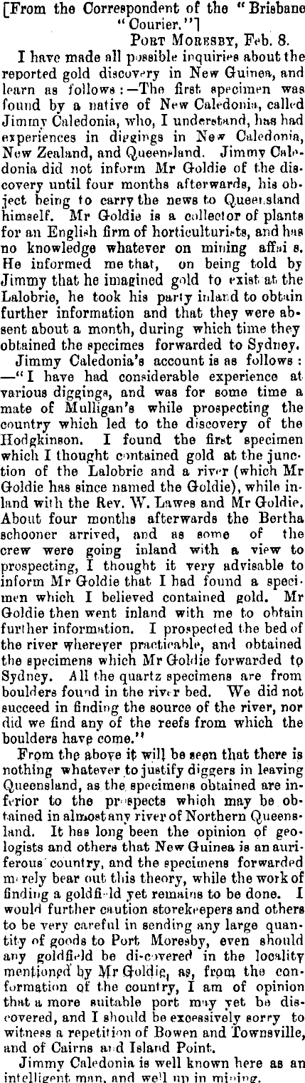 [From the Correspondent of the " Brisbane " Courier."! POBT MORESBY, Feb. 8. I have made all possible inquiries about tbe reported gold discovery in New Guinea, and learn as follows :—The first specimen was found by a native of New Caledonia, called Jimmy Caledonia, who, I understand, lias had experiences in dipgings in N«w Caledonia, New Zealand, and Queensland. Jimmy Caledonia did not inform Mr G-oldie of the discovery until four months afterwards, his object being to carry the news to Queei stand himself. Mr Goldie is a collector of plants for an English firm of horticulturists, and has no knowledge whatever on mining affui s. He informed me that, on being told by Jimmy that he imagined gold to exist at the Lalobrie, he took his party inland to obtain further information and that they were absent about a month, during which time they obtained the specimes forwarded to Sydney. Jimmy Caledonia's account is as follows : —" I have had considerable experience at various diggings, and was for some time a mate of Mulligan's while prospecting the country which led to the discovery of the Hodgkinson. I found the first specimen which I thought contained gold at the junction of the Lalobrie and a river (which Mr Q-oldie has since named the Goldie), while inland with the Rev. W. Lawes and Mr G-oldie. About four months afterwards the Bertha schooner arrived, and as some of the crew were going inland with a view to prospecting, I thought it very advisable to inform Mr Goldie that I had found a specimen which I believed contained gold. Mr Goldie then went inland with me to obtain further information. I prospected the bed of the river wherever practicable, and obtained the specimens which Mr Goldie forwarded to Sydney. All the quartz specimens are from boulders found in the rivi r bed. We did not succeed in finding the source of the river, nor did we find any of the reefs from which the boulders have come." From the aboye it will be seen that there is nothing whatever to justify diggers in leaving Queensland, as the specimens obtained are inferior to the pr spects which may be obtained in almostany river of Northern Queensland. It has long been the opinion of geologists and others that New Guinea is an auriferous country, and the specimens forwarded in rely bear out this theory, while the work of finding a gold fi Id yet remains to be done. I woulH further caution storekeepers and others to be very careful in sending any large quantity of goods to Port Moresby, even should any goldfield be di-crvered in the locality mentjonpd' by Mr Goldie, a?, frpm the conformation of the country, I am of opinion that a more suitable port may yet ba discovered, and I should be excessively sorry to witness a repetition of Bowen and Townsville, and of Cairns at d Island Point. Jimmy Caledonia is well known here as an intelligent man, and we'l up in mi"i"£r.