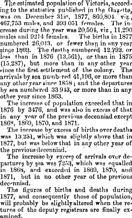 The estimated population of "Victoria, according to the statistics published jn the whs on December Slit, 1877, 860,801 "viz, 467,753 males, and 393 031 females. The increase during the year was 20,504, viz , 11,290 males and 9214 females. 'Die births in 1877 numbered 26 ; 0!3, ov fewer tha-p. in any year oinpe 1869,. The deaths numbered 12,792, or less than in 1876 (13,561), pr than in i 875 (15,287), but more than in any other year idnce the firßt settlement of the colony. The arrivals by sea numbered 41,196, or more than any otheryear since 1858 ; and the departures by sea numbered 33 913, or more than in any other year since 1863. The increase of population exceeded that in 1876 by 3476, and was alt-o in excess of that in any year of the previous decenniad except 1868, 1869, 1870, and 1871. The increase by'excess of births over deaths was 13,2a1, which was slightly above that in 1877, but was below that in any other year of the previous decenniad. The increase by except) of arrivals departureg by gea was 7253, which wns equalled in J. 868, and exceeded in 1809, 1870, and 1871, but in no other year of the previous decenniad. The figures of births and deaths during 1877, and consequently those of population, will probably be slightly altered when the returns of the deputy registrars are finally examined.