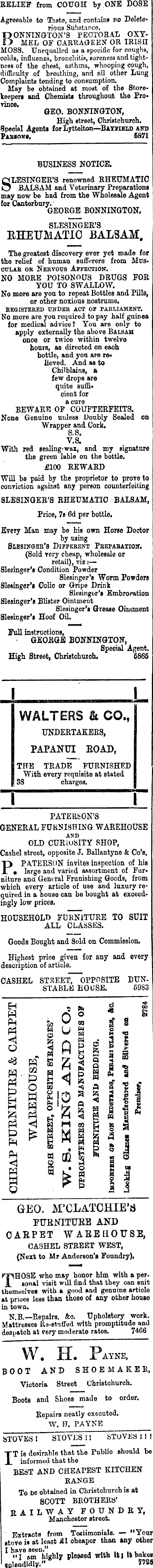 RELIEF from COUGH by ONE DOSE Agreeable to Taste, and contain* no Deleterious Substance. BONNINGTON'S PECTORAL OXYMEL OF CARRAGEEN OR IRIBII MOSS. Unequalled as a specific for coughs, colds, influenza, bronchitis, soreness and tightness of the chest, asthma, whooping cough, difficulty of breathing, and all other Lung Complaints tending to consumption. May be obtained at most of the Storekeepers and Chemists throughout the Pro* vince. GEO. BONNINGTON, High street, Christohurch. Special Agents for Lyttelton—Bayfield and PABOOW. 6871 BUSINESS NOTICE. renowned RHEUMATIC f BALSAM and Veterinary Preparations ty now be had from the Wholesale Agent (or Canterbury. GEORGE BONNINGTON. SLESINGER'S BHEUMATIO BALSAM. The greatest discovery ever yet made for the relief of human sufferers from Musculab or Nervous Affection. NO MORE POISONOUS DRUGS FOR YOU TO SWALLOW. No more are you to repeat Bottles and Pills, or other noxious nostrums. REGISTERED UNDER ACT OF PARLIAMENT. No more are you required to pay half guinea for medical advioe? You are only to apply externally the above Balsam once or twice within twelve hours, as directed on each bottle, and you are re* lieved. And as to Chilblains, a few drops are quite Buffi« cient for a cure BEWARE OF COUFTERFEITS. None Genuine uuless Doubly Sealed on Wrapper and Cork, S.S. v.s. With red sealing-wax, and my signature the green lablo on the bottle. £IOO REWARD Will be paid by the proprietor to prove to conviction aguinst any person counterfeiting SLESINGER'S RHEUMATIC BALSAM, Price, 7s 6d per bottle. Every Man may be his own Horse Doctor by using Si/BBinoee'b Different Preparation. (Sold very cheap, wholesale or retail), viz:— Slesinger's Condition Powder Slesinger's Worm Powders Slesinger's Colio or Gripe Drink Slesingor's Embrocation Slesinger's Blister Ointment Slesinger's Grease Ointment Slesinger's Hoof Oil. Full instructions, GEORGE BONNINGTON, Special Agent. High Street, Christchuioh. 6865 UNDERTAKERS, PAPANUI BOAD, THE TRADE FURNISHED With every requisite at stated 8 charges. PATERSON'S GENERAL FURNISHING WAREHOUSE AND OLD CURIOSITY SHOP, Cashel street, opposite J. Ballantyne & Co's. i PATERSUN invites inspection of his e large and varied assortment of Furniture and Central Frunishing Goods, from which every article of use and luxury required in a house can be bought at exceedingly low prices. HOUSEHOLD FURNITURE TO SUIT ALL CLASSES. Goods Bought and Sold on Commission. Highest price given for any and every description of article. CASHEL STREET, OPPOSITE DUNSTABLE BOUSE. 5983 <% r e £ £ GEO. ATOLATCHIE'S FUBNITUBE AND OABPET W ABEIIOTTSE, CASHEL STREET WEST, (Next to Mr Anderson's Foundry). PjnHOSK who may honor him with a perJL aonal visit wdl find that they can suit themeelves with a good and genuine artiolo at prices less than those of any other house in town. N.B.—Repairs, ko. Upholstery work. Mattresses Ra-statfed with promptitude and despatch at v&ry moderate rates. 7466 AYNE, BOOT AND SHOEMAKER, Victoria Street Christchurch. Boots and Shoes made to order. Repairs neatly executed. W. H. PAYNE STOVES 1 STOVES!! STOVES 1I I T is desirable that the Public should be informed that the BEST AND CHEAPEST KITCHEN RANGE To be obtained in Christchurch is at SCOTT BROTHERS' RAILWAY FOUNDRY, Manchester street. Extracts from Testimonials. "Your stove is at least £1 cheaper than any other I have seen." . , ... ~ ~. , "I *m highly pleased with lfe| Itbakee I «.,i a „,4Wlv." 7728