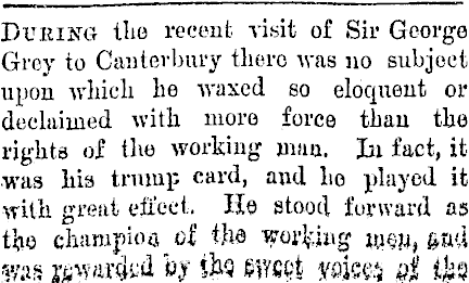 During the recent visit oi' Sir George Grey to Canterbury there was no subject upon winch he waxed so eloquent or declaimed with more force than the rights of the working mau. In tact, it was his trump card, and ho played it with great effect. He stood forward as the ehampioa of the working xnm, m>X