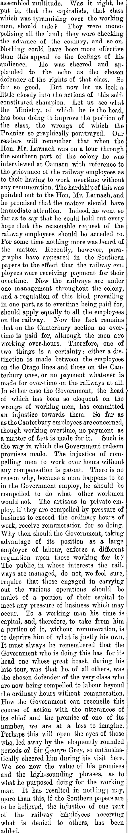 assembled multitude. Was it right, ho put it, that the capitalists, that class which was tyrannising over the working men, should rule ? They were monopolising all the land; they wore chocking the advance of tlie country, and so on. Nothing could have been more effective than this appeal to the feelings of his audience. Ho was cheered and applauded to the echo as the chosen defender of the rights of that class. So far so good. But now lot us look a little closely into the actions of this selfconstituted champion. Lot us see what the Ministry, of which ho is the head, has been doing to improve the position of the class, the w r rongs of which the Premier so graphically pourtrayed. Our readers will remember that when the Hon. Mr. Lavnach was on a tour through the southern part of the colony he was interviewed at Oamaru with reference to the grievance of the railway employees as to their having to work overtime without any remuneration. The hardship of this was pointed out to the Hon. Mr. Larnaeh, and he promised that the matter should have immediate attention. Indeed, he went so far as to say that ho could hold out every hope that the reasonable request of the railway employees should be acceded to. For some time nothing more was heard of the matter. Recently, however, paragraphs have appeared in the Southern papers to the effect that the railway employees wore receiving payment for their overtime. Now the railways are under one management throughout the colony, and a regulation of this kind prevailing in one part, as to overtime being paid for, should apply equally to all the employees on the railway. Now the fact remains that on the Canterbury section no overtime is paid for, although the men are working over-hours. Therefore, one of two things is a certainty: either a distinction is made between the employees on the Otago lines and those on the Canterbury ones, or no payment whatever is made for over-time on the railways at all. In either case the Government, the head > of which has been so eloquent on the wrongs of working men, has committed an injustice towards them. So far as as the Canterbury employees are concerned, though working overtime, no payment as a matter of fact is made for it. Such is the way in which the Government redeem promises made. The injustice of compelling men to work over hours without any compensation is patent. There is no reason why, because a man happens to bo in the Government employ, he should bo compelled to do what other workmen would not. The artisans in private employ, if they are compelled by pressure of business to exceed the ordinary hours of work, receive remuneration for so doing. Why thou should the Government, taking advantage of its position as a largo employer of labour, enforce a different regulation upon those working for it ? The public, in whose interests the railways are managed, do not, wo feel sure, require that those engaged in carrying out the various operations should bo mulct of a portion of their capital to meet any pressure of business which may occur. To a working man his time is capital, and, therefore, to take from him a portion of it, without remuneration, is to deprive him of what is justly his own. It must always bo remembered that the Government who is doing this has for its head one whoso great boast, during his late tour, was that ho, of all others, was the chosen defender of the very class who are now being compelled to labour beyond the ordinary hours without remuneration, How the Government can reconcile this course of action with the utterances of its chief and the promise of one of its number, we are at a loss to imagine. Perhaps this will open the eyes of those who, led away by the eloquently rounded periods of Sir George Grey, so enthusiastically cheered him during his visit here. We see now the value of his promises and the high-sounding phrases, as to what ho purposed doing for the working man. It has resulted in nothing; nay, more than this, if the Southern papers are to bo believed, the injustice of one part of the railway employees receiving what is denied to others, has been added.