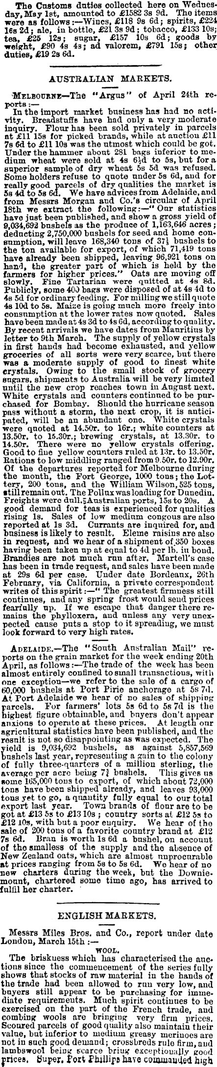 The Customs duties collected here on Wednesday, May Ist, amounted to £1582 3s 9d. The items were as follows:—Wines, £llß 9s 6d; spirits, £224 16s 2d; ale, in bottle, £2l 3s 9d; tobacco, £133 10s; tea, £26 12s; sugar, £157 10s 6d; goods by weight, £9O 4s 4s; ad valorem, £791 15s; other duties, £l9 2s 6d. AUSTRALIAN MARKETS. Melbourne—The "Argus" of April 24th reports:— In the import market business has had no activity. Breadstuff si have had only a very moderate inquiry. Flour has been sold privately in parcels at £ll 15s for picked brands, while at auction £ll 7s 6d to £lllos was the utmost which could be got. Under the hammer about 281 bags inferior to medium wheat were sold at 4s 6jd to ss, but for a superior sample of dry wheat 5s 5d was refused. Some holders refuse to quote under 5s 6d, and for really good parcels of dry qualities the market is 5s 4d to 5s 6d. We have advices from Adelaide, and from Messrs Morgan and Co.'s circular of April 18th we extract the following :—" Our statistics have just been published, and show a gross yield of 9,034,692 bushels as the produce of 1,163,646 acres ; deducting 2,750.000 bushels for seed and home consumption, will leave 168,340 tons of 371 bushels to the ton available for export, of which 71,419 tons have already been shipped, leaving 96,921 tons on hand, the greater part of which is held by the farmers for higher prices." Oats are moving off slowly. Fine Tartarian were quitted at 4s Bd. Publicly, some 400 bags were disposed of at 4s 4d to 4s 5d for ordinary feeding. For milling we still quote 4s lOd to ss. Maize is going much more freely into consumption at the lower rates now quoted. Sales have been made at 4s 3d to Is 6d, according to quality. By recent arrivals we have dates from Mauritius by letter to 9th March. The supply of yellow crystals in first hands had become exhausted, and yellow groceries of all sorts were very scarce, but there was a moderate supply of good to finest white crystals. OwiDg to the small stock of grocery sugars, shipments to Australia will be very limited until the new crop reaches town in August next. White crystals and counters continued to be purchased for Bombay. Should the hurricane season pass without a storm, the next crop, it is anticipated, will be an abundant one. White crystals were quoted at 14.50 r. to 16r.; white counters at 13.50 r. to 15.30 r.; brewing crystals, at 13.30 r. to 14.50 r. There were no yellow crystals offering. Good to fine yellow counters ruled at 13r. to 13.50 r. Rations to low middliug ranged from 9.50 r, to 12.90 r. Of the departures reported for Melbourne during the month, the Fort George, 1000 tons; the Lottery, 200 tons, and the William Wilson, 525 tons, ■till remain out. The Pollux was loading for Dunedin. Freights were dull.;Australian ports, 15s to 20s. A good demand for teas is experienced for qualities rising Is. Sales of low medium congous are also reported at Is 3d. Currants are inquired for, and business is likely to result. Eleme raisins are also in request, and wo hear of a shipment of .350 boxes having been taken up at equal to 4d per lb. in bond. Brandies are not much run after. Martell's case has been in trade request, and sales have been made at 29s 6d per case. Under date Bordeaux, 26th February, via California, a private correspondent writes of this spirit:—" The greatest firmness still continues, and any spring frost would send prices fearfully up. If we escape that danger there remains the phylloxera, and unless any very unexpected cause puts a stop to it spreading, we must look forward to very high rates. Adelaide.—The "South Australian Mail" reports on the grain market for the week ending 20th April, as follows:—The trade of the week has been almost entirely confined to small transactions, with one exception—we refer to the sale of a cargo of 60,000 bushels at Port Pirie anchorage at 5s 7<l. At Fort Adelaide we hear of no sales of shipping parcels. For farmers' lots 5s 6d to 5s 7d is the highest figure obtainable, and bnyers don't appear anxious to operate at these prices. At length our agricultural statistics have been published, and the resnlt is not so disappointing as was expected. The yield is 9,034,692 bushels, as against 5,857,569 bushels last year, representing a gain to the colony of fully three-quarters of a million sterling, the average per acre being 7J bnshels. This gives us some 165,000 tons to export, of which about 72,000 tons have been shipped already, and leaves 93,000 tons yet to go, a quantity fully equal to our total export last year. Town brands of flour are to be got at £l3 5s to £l3 10s ; country sorts at £l2 5s to £l2 10s, with but a poor enquiry. We hear of the sale of 200 tons of a favorite country brand at £l2 7s 6d. Bran is worth Is 6d a bushel, on account of tho smalless of the supply and the absence of New Zealand oats, which are almost unprocurable at prices ranging from 5s to 5s 6d. Wo hear of no new charters during the week, but the Downiemount, chartered some time ago, has arrived to fulfil her charter. ENGLISH MARKETS. Messrs Miles Bros, and Co., report under date London, March 15th : WOOL. The briskness which has characterised the anctions since the commencement of the series fully shows that stocks of raw material in the hands of the trade had been allowed to rnu very low, and buyers still appear to be purchasing for immediate requirements. Much spirit continues to be exercised on the part of the French trade, and combing wools are bringing very firm prices. Scoured parcels of good quality also maintain their value, but inferior to medium greasy meriuoes are not in such good demand; crossbreds rulo firm, and lauibswool being scarce briug exceptionally good prices, fciuper, Port Phillips have comwaniied high