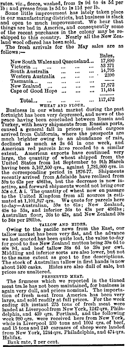 rates, viz., fleece, washed, from 2s 9d to 4s 5d per lb ; and grease from Is 5d to Is lid per lb. Some little improvement has lately taken place in oiir manufacturing districts, but business is slack and open to much improvement. Wo hear that things are bad in America, and consequently somo of the recent purchases in the colony may be reshipped to this country. Nearly all the New Zealand wool offered has been sold. The fresh arrivals for the May sales are as follows: _, , Bales. New South Wales and Queensland... 17,890 Victoria 5? 371 South Australia W. 795 Western Australia ' 2390 Tasmania ' New Zealand 17,872 Cape of Good Hopo l\,-i6i Total 117,472 WHEAT AND FLOUR. Business in our wheat market during the past fortnight has been very depressed, and news of the peaco having been concluded between Russia and Turkey, with heavy shipments from Eussian ports, caused a general fall in prices; indeed cargoes arrived from California, where the prospects are much brighter owing to an abundance of rain, declined as much as 3s 6d in one week, and American red parcels hr.vo receded to a similar extent. American exports have continued very large, the quantity of wheat shipped from the United States from Ist September to 9th March having been 5,167,500 qrs., against 1,781,000 qrs. in the corresponding period in 1876-77. Shipments recently arrived from Adelaide have realised from 59s to 63s per 4961b5, but the decrease is now inactive, and forward shipments would not bring over 52s c.f. A i. The quantity of wheat now on passage to the United Kingdom from all sources is estimated at 1,101,927 qrs. We quote for parcels here to-day—Australian, 59s to 61s; New Zealand, 45s to 535, and inferior 36s to 43s per 4961b5; Australian flour, 36s to 425, and New Zealand 80s to 34s per 2801bs. TALLOW AND HIDES. Owing to the pacific news from the East, our tallow market has been very fiat, and the advance we last quoted has been quite lost, the value to-day for good to fine New Zealand mutton being 39s 6d to 40s 9d, and beef tallow 38s 6d to 39s per cwt. Middling and inferior sorts are also lower, but not to the same extent as gooi to fine descriptions. The stock of Australian 1 allow in first hands is now about 3400 casks. Hides are also dull of sale, but prices are unaltered. PRESERVED MEAT. The firmness which we reported in the tinned meat traie has not been maintained, for business is again very dull, and prices nominal. The importation of fresh meat from America has been very large, and sold readily at fnll prices. For the week ending 4th instant 275 tons of fresh meat were landed at Liverpool from New York, 1242 qrs. Philadelphia, and 439 qrs. Portland, and the following week 980 qrs. were received here from New York, while in Liverpool 330 tons and 1002 qrs. of beef, and 15 tons and 240 carcases of sheep were landed from New York, 1244 qrs. Philadelphia, and 474 qrs. Halifax. Bank rate, 2 per cent.