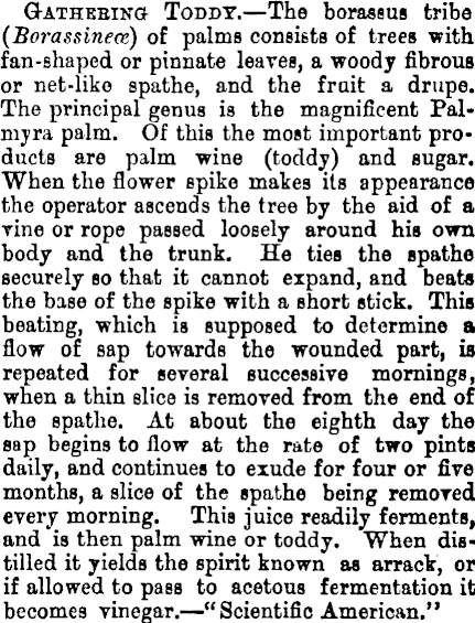 Gathebing Toddy.—The borasaus tribe (Borassinetr:) of palms consists of trees with fan-shaped or pinnate leaveß, a woody fibrous or net-like spathe, and the fruit a drupe. The principal genus is the magnificent Palmyra palm. Of this the most important products are palm wine (toddy) and sugar. When the flower spike makes its appearance the operator ascends the tree by the aid of a rine or rope passed loosely around his own body and the trunk. He ties the spathe securely so that it cannot expand, and beats the base of the spike with a short stick. This beating, which is supposed to determine a flow of sap towards the wounded part, is repeated for several successive mornings, when a thin slice is removed from the end of the spathe. At about the eighth day the sap begins to flow at the rate of two pints daily, and continues to exude for four or five months, a slice of the spathe being removed every morning. This juice readily ferments, and is then palm wine or toddy. When distilled it yields the spirit known as arrack, or if allowed to pass to acetous fermentation it becomes vinegar.—" Scientific American."