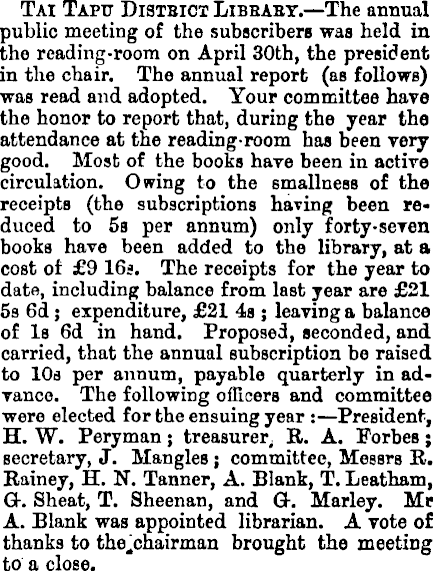 Tai Tapu Disteict Libbaby.—The annual public meeting of the subscribers was held in the reading-room on April 30th, the president in the chair. The annual report (as follows) was read and adopted. Your committee have the honor to report that, during the year the attendance at the reading-room has been very good. Most of the books have been in active circulation. Owing to the smallness of the receipts (the subscriptions having been reduced to 5s per annum) only forty-seven books have been added to the library, at a cost of £9 16s. The receipts for the year to date, including balance from last year are £2l 5s 6d ; expenditure, £2l 4s ; leaving a balance of Is 6d in hand. Proposed, seconded, and carried, that the annual subscription be raised to 10s per annum, payable quarterly in advance. The following officers and committee were elected for the ensuing year : —President, H. W. Peryman; treasurer, E. A. Forbes; secretary, J. Mangles ; committee, Messrs R. Rainey, H. N. Tanner, A. Blank, T. Leatham, G-. Sheat, T. Sheenan, and G-. Marley. Mr A. Blank was appointed librarian. A vote of thanks to brought the meeting to a close.