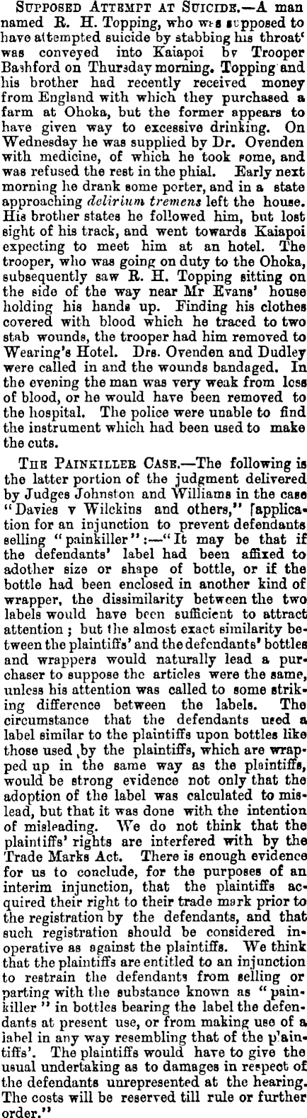 Supposed Attempt at Suicide.—A man named It. H. Topping, who w*s itpposed to have attempted suicide by stabbing his throat' was conveyed into Kaiapoi bv Trooper Baihford on Thursday morning. Topping and his brother had recently received money from England with which, they purchased a farm at Ohoka, but the former appears to have given way to excessive drinking. On Wednesday he was supplied by Dr. Ovenden with medicine, of which he took pome, and was refused the rest in the phial. Early next morning he drank Borne porter, and in a state approaching delirium tremens left the house. His brother states he followed him, but lost sight of his track, and went towards Kaiapoi expecting to meet him at an hotel. The trooper, who was going on duty to the Ohoka, subsequently saw It. H. Topping sitting on the side of the way near Mr Evans' house holding his hands up. Finding his clothes covered with blood which he traced to two stab wounds, the trooper had him removed to Wearing's Hotel. Drs. Ovenden and Dudley were called in and the wounds bandaged. In the evening the man was very weak from loss of blood, or he would have been removed to the hospital. The police were unable to find the instrument which had been used to make the cuts. The Painkiller Case.—The following is the latter portion of the judgment delivered by Judges Johnston and Williams in the case "Davies v Wilckins and others," [application for an injunction to prevent defendants selling "painkiller":—"lt may be that if the defendants' label had been affixed to adother size or shape of bottle, or if the bottle had been enclosed in another kind of wrapper, the dissimilarity between the two labels would have been sufficient to attract attention ; but the almost exact similarity between the plaintiffs' and the defendants' bottles and wrappers would naturally lead a purchaser to suppose the articles were the same, unless his attention was called to some striking difference between the labels. The circumstance that the defendants ueed a label similar to the plaintiffs upon bottles like those used t by the plaintiffs, which are wrapped up in the same way as the plaintiffs, would be strong evidence not only that the adoption of the label was calculated to mislead, but that it was done with the intention of misleading. We do not think that the plaintiffs' rights are interfered with by the Trade Marks Act. There is enough evidence for us to conclude, for the purposes of an interim injunction, that the plaintiffs acquired their right to their trade mark prior to the registration by the defendants, and that such registration should be considered inoperative as against the plaintiffs. We think that the plaintiffs are entitled to an injunction to restrain the defendant? from selling or parting with the substance known as " painkiller " in bottles bearing the label the defendants at present use, or from making use of a label in any way resembling that of the pontiffs'. The plaintiffs would have to give the usual undertaking as to damageß in respect of the defendants unrepresented at the hearing. The costs will be reserved till rule or further order."