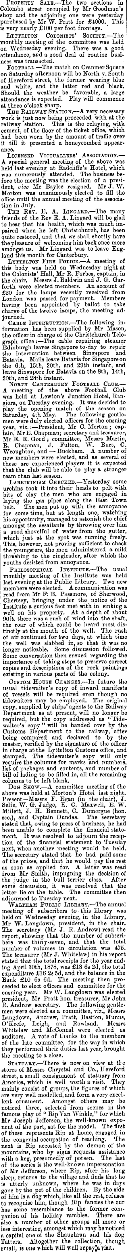 Peopebty Sale.—The two sections in Colombo Btreet occupied by Mr G-oodman's shop and the adjoining one were yesterday purchased by Mr W. Pratt for £IOOO. This is very nearly £IOO per foot frontage. Ltttelton Colonists' Society.—The monthly meeting of the committee was held on Wednesday evening. There was a good attendance, and a good deal of routine business was transacted. Football. —The match on Cranmer Squai-e on Saturday afternoon will be North v. South of Hereford street, the former wearing blue and white, and the latter red and black. Should the weather be favorable, a large attendance is expected. Play will commence at three o'clock sharp. The Railway Station.—A very neceßsary work is just now being proceeded with at the railway station. This is the relaying, with cement, of the floor of the ticket office, which had been worn by the amount of traffic over it till it presented a honeycombed appearance. Licensed Victtjallbbs' Association. — A special general meeting of the above was held last evening at Radcliffe's Hotel, which was numerously attended. Tho business before the meeting was the olection of a president, vice Mr Baylee resigned. Mr J. W. Morton was unanimously elected to fill the office until tho annual meeting of the association in July. The Rev. B. A. Lingaed.—The many friends of the Rev E. A. Lingard will be glad to hear that his health, which was much impaired when he left Christchurch, has been quite restored, and that we shall shortly have the pleasure of welcoming him back once more amongst us. Mr Lingard was to leave England this month for Canterbury. Lyttelton Fibe Police. —A meeting of this body was held on Wednesday night at the Colonists' Hall, Mr R. Forbes, captain, in the chair. Messrs J. Baldwin and J. Q-. Garforth were elected members. An account of £2O for the lamps recently received from London was passed for payment. Members having been appointed by ballot to take charge of the twelve lamps, the meeting adjourned. Cable Inteebuttion. —The following information has been supplied by Mr Mason, the officer in charge of the Christchurch Telegraph office : —The cable repairing steamer Edinburgh leaves Singapore to-day to repair tho interruption between Singapore and Batavia. Mails leave Batavia for Singapore on the 6th, 15th, 20th, and 29th instant, and leave Singapore for Batavia on the Bth, 14th, 20th, and 28th instant. Nobth Cantebbitey Football Club. — A meeting of the above Football Club was held at Lewton's Junction Hotel, Rangiora, on Tuesday evening. It was decided to play the opening match of the season on Saturday, 4th May. The following gentlemen were duly elected officers for the ensuing year, viz.: —President, Mr C. Merton ; captain, Mr E. Chapman; secretary and treasurer, Mr E. R. G-ocd ; committee, Messrs Martin, R. Chapman, J. Fulton, W. Burt, C. Wroughton, and Buckham. A number of new members were elected, and as several of these are experienced players it is expected that the club will be able to play a stronger team than last season. Laebikinism Checked. —Yesterday some urchins took it into their heads to pelt with bits of clay the men who are engaged in laying the gas pipes along the East Town belt. The men put up with the annoyance for some time, but at length one, watching his opportunity, managed to astonish the chief amongst the assailants by throwing over him a good shovelful of water from the gutter, which just at the spot was running freely. This, however, not proving sufficient to check the youngsters, the men administered a mild thrashing to the ringleader, after which the youths desisted from annoyance. Philosophical Institute.—The usual monthly meeting of the Institute was held last evening at the Public Library. Two new members were elected. A communication was read from Mr F. B. Passinore, of Sherwood, Chertsey, bringing under the notice of the Institute a curious fact met with in sinking a well on his property. At a depth of about 90ft. there was a rush of wind into the shaft, the roar of which could be heard most distinctly at the mouth of the well. The rush of air continued for two days, at which time the well was slabbed in, so that it was no longer noticable. Some discussion followed. Some conversation then ensued regarding the importance of taking steps to preserve correct copies and descriptions of the rock paintings existing in various parts of the colony. Custom: House Changes.—ln future the ÜBual tidewaiter's copy of inward manifests of vessels will be required even though no tidewaiters may be employed. The original copy, supplied by ships' agents to the Railway Department as at present, will no longer be required, but the copy addressed as " Tidewaiter's copy " will be handed over by the Customs Department to the railway, after being compared and declared to by the master, verified by the signature of the officer in charge at the Lyttelton Customs office, and stamped. The tidewaiter's copy will only require the columns for marks and numbers, list of packages and contents, and number of bill of lading to be filled in, all the remaining columns to be left blank. Dog Show.—A committee meeting of the above was held at Morton's Hotel last night. Present—Messrs F. Egan (in the chair), J. Selfe, W. G. Judge, E. C. Maxwell, E. W. Millett, J. H. Bennett, C. Dumcrgue (hon. sec), and Captain Dundas. The secretary stated that, owing to press of business, he had been unable to complete the financial statement. It was resolved to adjourn the reception of the financial statement to Tuesday next, when another meeting would be held. The secretary stated that he had paid some of the prizes, and that he would pay the rest as soon as applied for. A letter was read from Mr Smith, impugning the decision of the judge in the bull terrier class. After some discussion, it was resolved that the letter lie on the table. The committee then adjourned to Tuesday next. Waltham Public Libeaby.—The annual mee
