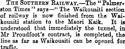 The Southern Railway.—The "PalmerBton Times " says —" The Waikouaiti section of railway is now finished from the Waikouaiti station to tbe Maori Kaik. It is understood that immediately the tunnel, in Mr Proudfoot's contract, is completed, the line as far as Waikouaiti can he opened for traffic.