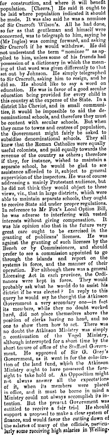 for construction, and where it will benefit population. [Cheers.] He eaid it ought to be laid where population indicated it should be made. It was also said he was a nominee of Sir Cracroft Wilson's. All he had done, so far as that gentleman and himself were concerned, was to telegraph to him, saying ho (Mr Ingles) was coming forward, and asking Sir Cracroft if he would withdraw. He did not understand the term "nominee" as applied to him, unless some of his friends had possession of a dictionary in which the meaning of that word was given differently to that set out by Johnson. He simply telegraphed to Sir Cracroft, asking him to resign, and he did so. He should like to say a word on education. He was in favor of a good secular education being provided for every child in this country at the expense of the State. In a district like Cheviot, and in small communities, it would be impossible to aid the denominational schools, and therefore they must be content with secular schools. But when they came to towns and centres of population, the Government might fairly be asked to subsidise denominational schools. They all knew that the Roman Catholics were equally useful colonists, and paid equally towards the revenue of the country as others 5 therefore if they, for instance, wished to maintain a separate school, he would be glad to see asaistance afforded to it, subject to general supervision of the inspectors. He was of course addressing a mainly Protestant audience, but he did not think they would object to these views, viz., that in large districts, which were able to maintain separate schools, they ought to receive State aid under proper regulations. In reference to Mr Pox's Local Option Bill, he was adverse to interfering with vested interests without giving compensation. It was his opinion also that in the future very great care ought to be exercised in the granting of publicans' licenses. He was against the granting of such licenses by the Bench or by Commissioners, and should prefer to see a commission appointed to go through the islands and report on the systems in force, and the manner of their operation. For although there was a general Licensing Act in each province, the Ordinances were kept in force. They would probably ask what he wonld do to assist his district if he was elected ? In reply to this query he would say he thought the Atkinson Government a very secondary one—in fact its members, while they no doubt worked hard, did not place themselves above the position of clerks haying no head, arid no one to show them how to act. There was no doubt the Atkinson Ministry was simply a continuation of the Yogel Ministry, although interrupted for a short time by the short tenure of office of the Stafford Government. He approved of Sir G. Grey's Government, n» it went in for the colonzation of the land fund, which the Atkinson Ministry ought to have possessed the foresight to take hold of. An Opposition might n..t always answer all the expectations of it, when its members were placed in office, and it must be borne in mind a Ministry could not always accomplish its intention. But the present Gorernment was entitled to receive a fair trial He should support a proposal to make a clear system of finance, and would favor the cutting down of the salaries of many of the officios, particularly gome receiying high salaries in Welling'