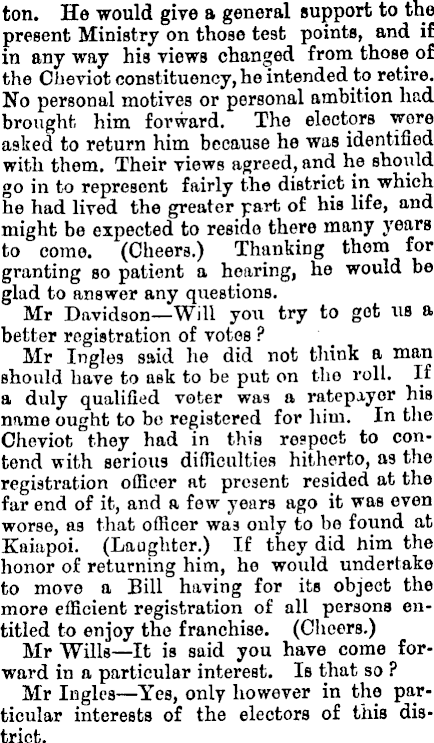ton. He would give a general support to the present Ministry on those test points, and if in any way his views changed from those of the Cheviot constituency, he intended to retire. No personal motives or personal ambition had brought him forward. The electors wore asked to return him because he was identified with them. Their views agreed, and he should go in to represent fairly the district in which he had lived the greater part of his life, and might be expected to reside there many years to come. (Cheers.) Thanking them for granting so patient a hearing, he would be glad to answer any questions. Mr Davidson—Will you try to got us a better registration of votes ? Mr Ingles said he did not think a man should have to ask to be put on the roll. If a duly qualified voter was a ratepayer his name ought to be registered for him. In the Cheviot they had in this respect to contend with serious difficulties hitherto, a 9 the registration officer at present resided at the far end of it, and a few years ago it was even worse, as that officer wa3 only to he found at Kaiapoi. (Laughter.) If they did him the honor of returning him, he would undertake to move a Bill having for its object the more efficient registration of all persons entitled to enjoy the franchise. (Cheers.) Mr Wills—lt is said you have come forward in a particular interest. Is that so ? Mr Ingles—Yes, only however in the particular interests of the electors of this district.
