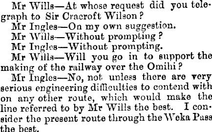Mr Wills—At whose request did you telegraph to Sir Oracrof t Wilson ? Mr Ingles—On my own suggestion. Mr Wills—Without prompting ? Mr Inglos—Without prompting. Mr Wills—Will you go in to support the making oil the railway over the Omihi ? Mr Ingles—No, not unless there are very serious engineering difficulties to contend with on any other route, which would make the line referred to by Mr Wills the best. I consider the present route through the Weka Pass the best.
