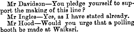 Mr Davidson —You pledge yourself to support the making of this line ? Mr Ingles —Yes, as I have stated already. Mr Hood—Would you urge that a polling booth be made at Waikari.