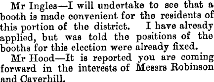 Mr Ingles—l will undertake to see that a booth is made convenient for the residents of this portion of the district. I have already applied, but was told the positions of the booths for this election were already fixed. Mr Hood—lt is reported you are coming forward in the interests of Messrs Robinson and Caverhill.