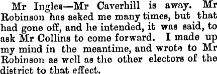 Mr Ingles—Mr Caverhill is away. Mr Robinson has asked me many times, but _ that had gone off, and he intended, it was said, to ask Mr Collins to come forward. I made up my mind in the meantime, and wrote to Mr Robinson as well as the other electors of the district to that effect.
