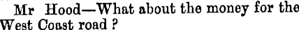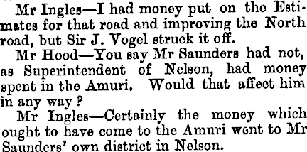 Mr Ingles—l had money put on the Estimates for that road and improving the North road, but Sir J. Vogel struck it off. Mr Hood —You say Mr Saunders had not, as Superintendent of Nelson, had money spent in the Amuri. Would that affect him in any way ? Mr Ingles—Certainly the money which ought to have come to the Amuri went to Mr Saunders' own district in Nelson.